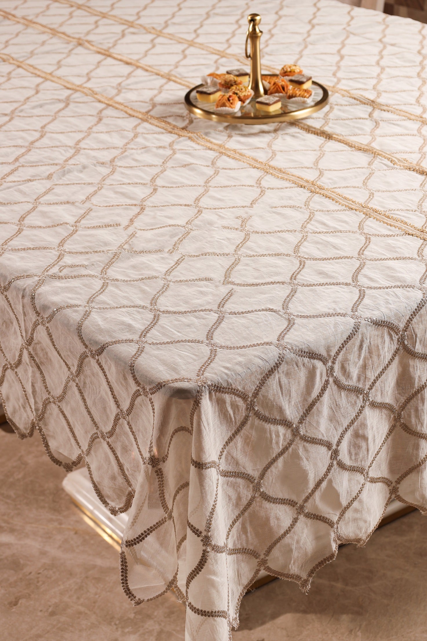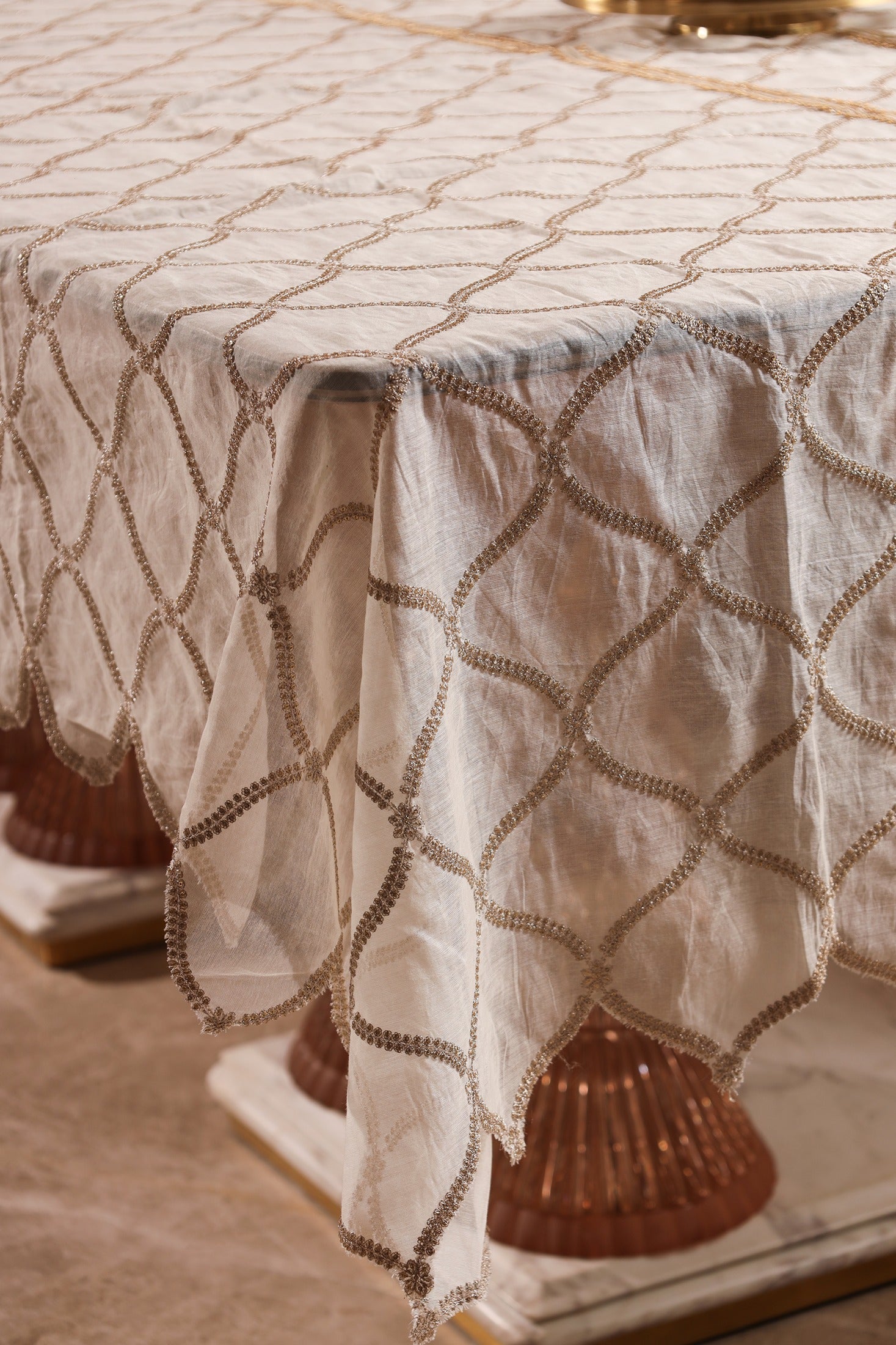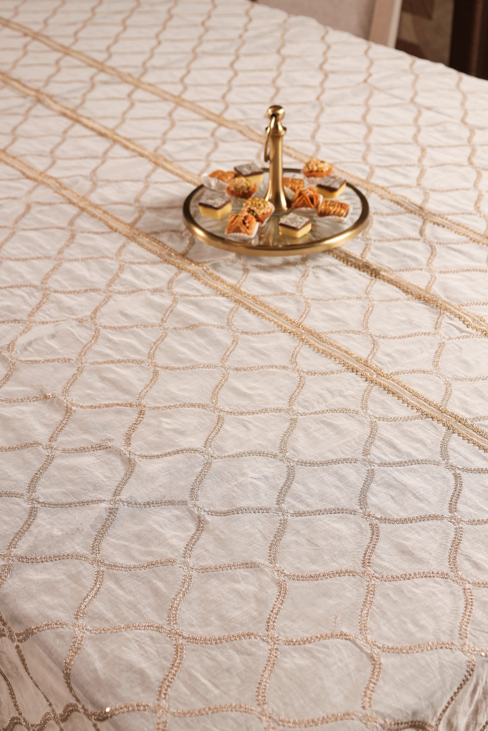 Aurelia showcases exquisite gold zari embroidery on soft mul Chanderi, celebrating timeless Indian craftsmanship in a modern luxury form. The intricate detailing and shimmer transform the dining table into a statement of regal elegance and sophistication, perfect for special occasions or a striking everyday touch.