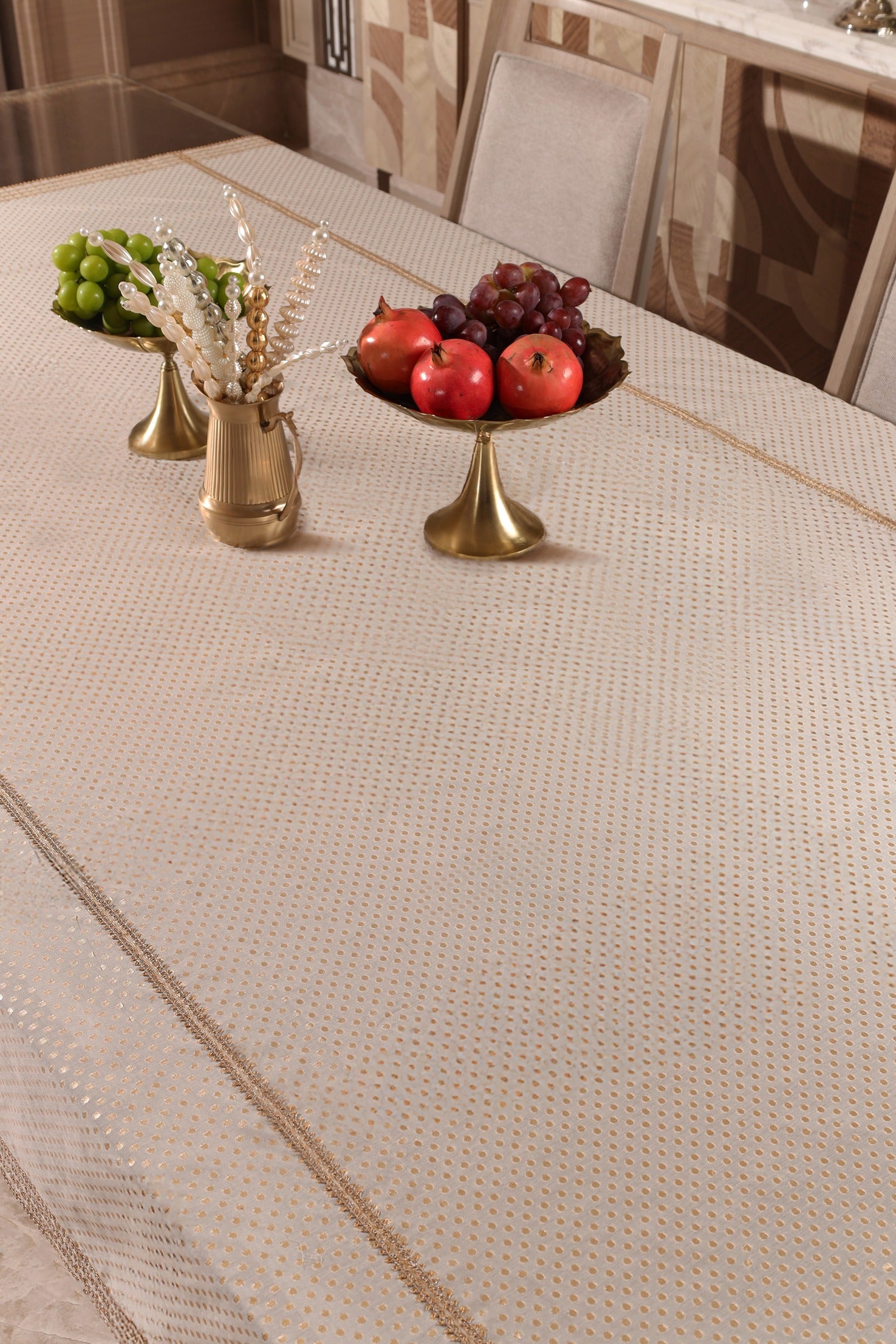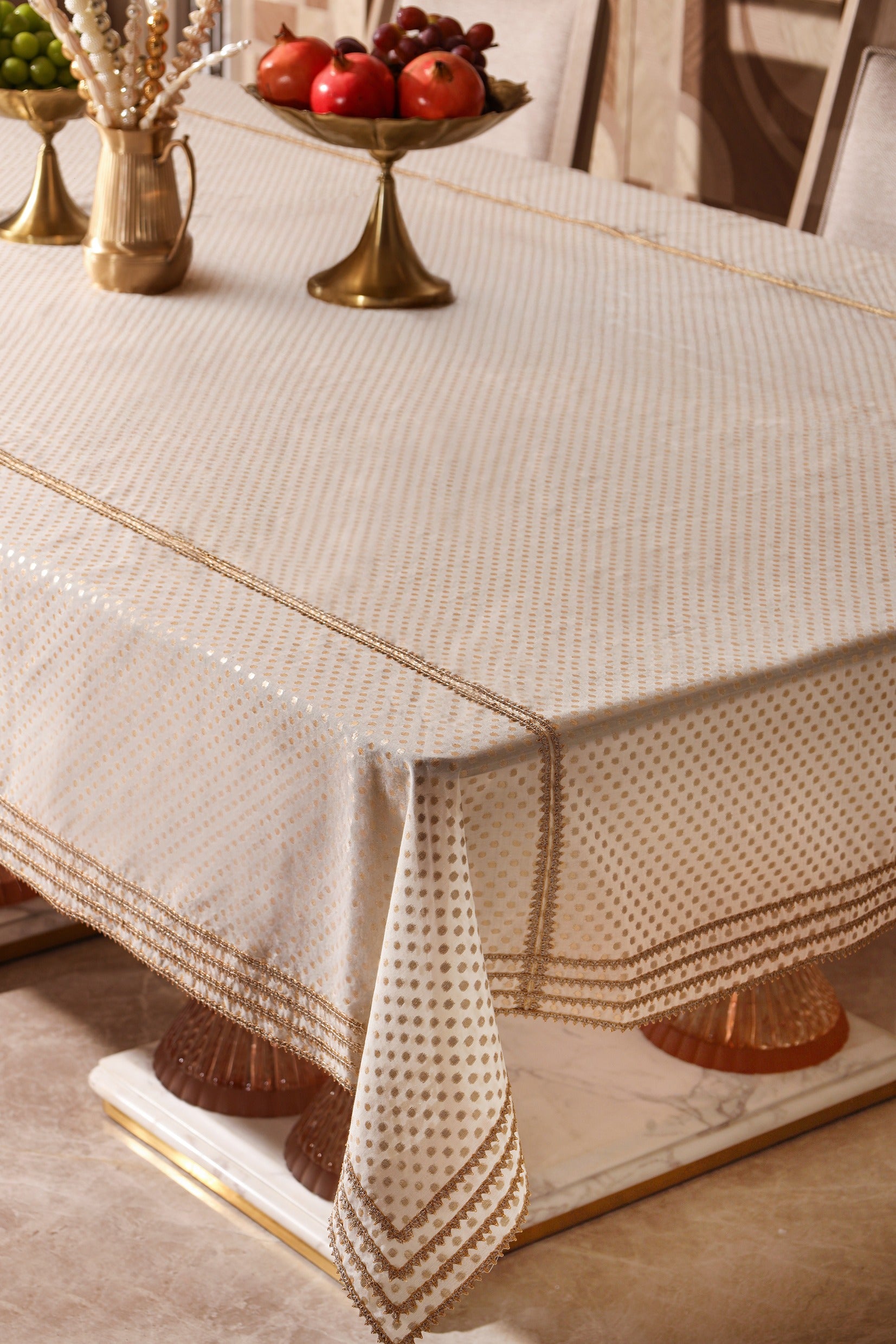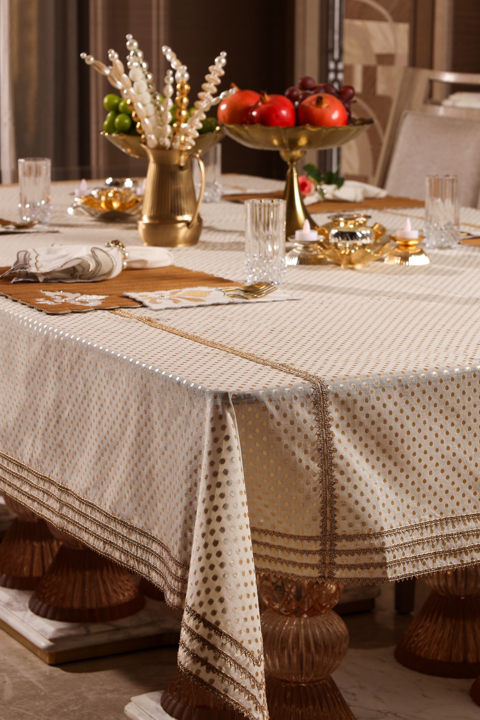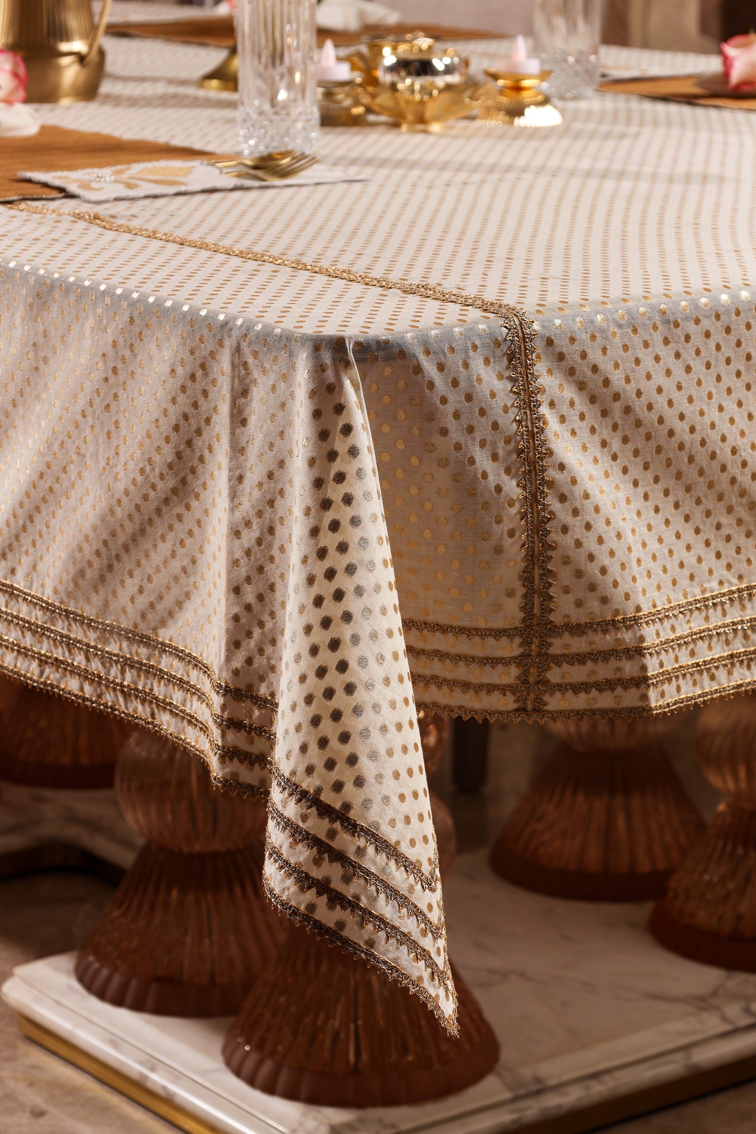 Circe celebrates the beauty of fluid, circular patterns on a soft ivory-gold Chanderi base. The design’s elegant circlescreate a harmonious rhythm, exuding refined sophistication and understated luxury. Perfect for both intimate dinners and grand celebrations, Circe transforms any table into a statement of modern opulence.
