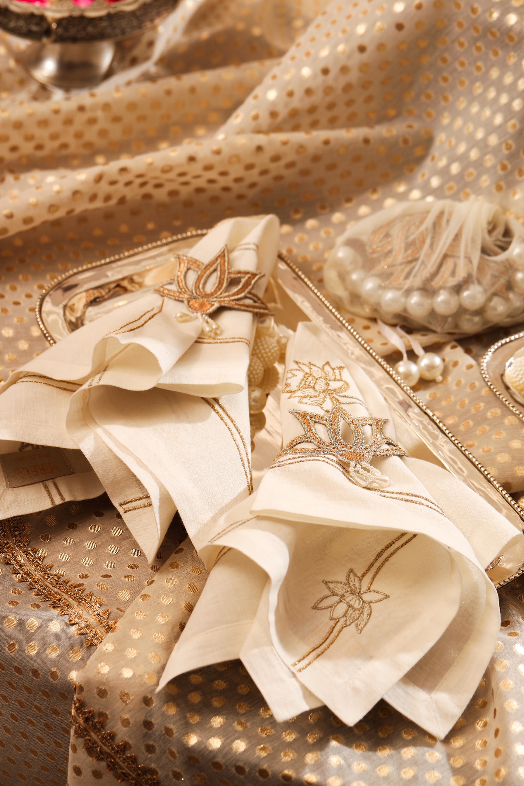These classic white napkins are exquisitely finished with embroidery all over, setting the stage for a refined table setting. To complete the look, a cutwork Lotus Napkin Rings add a gleaming, opulent finishing touch. This set includes :