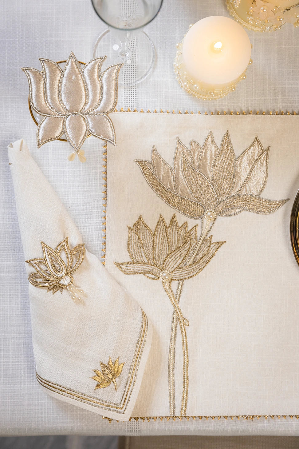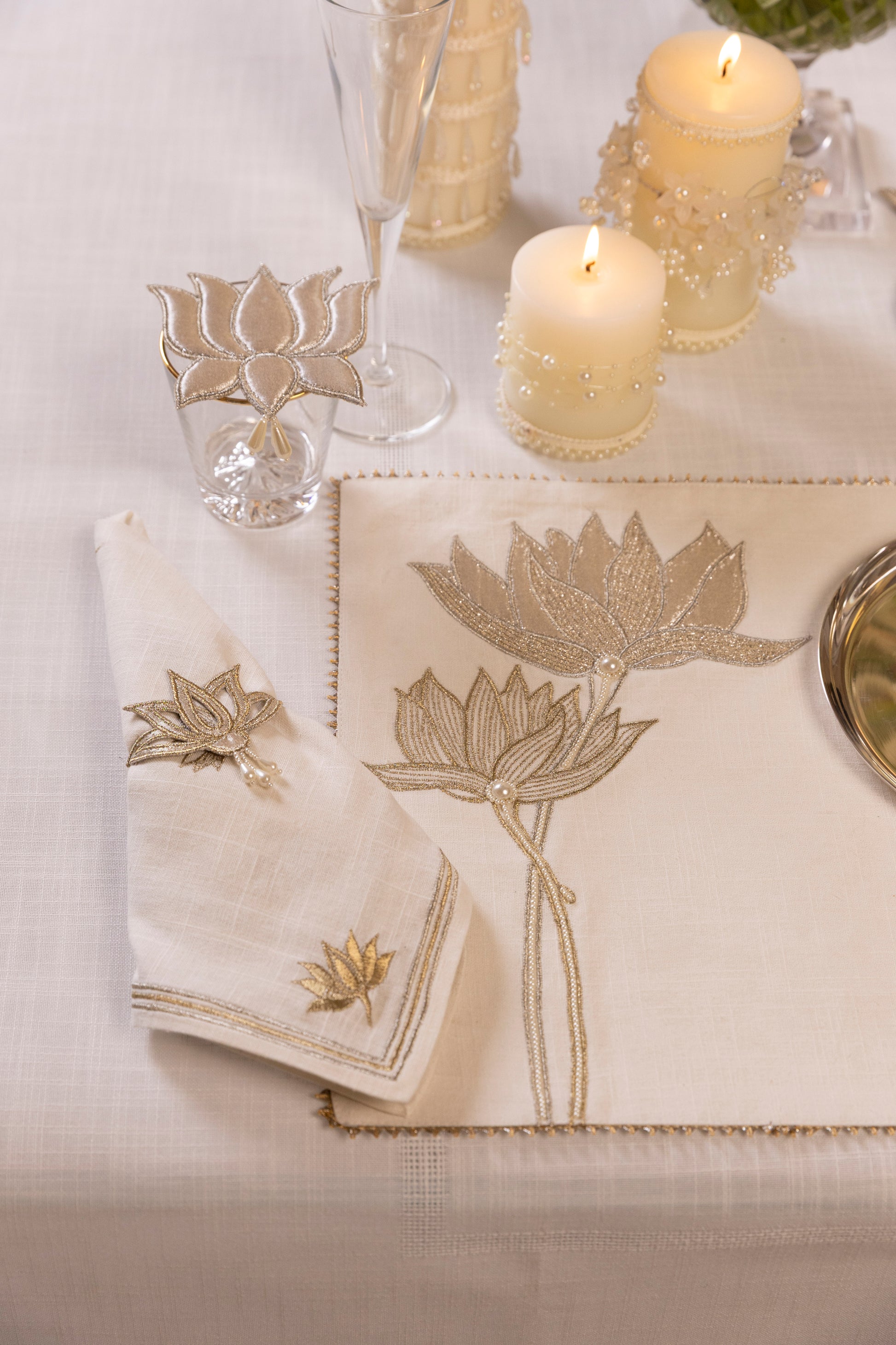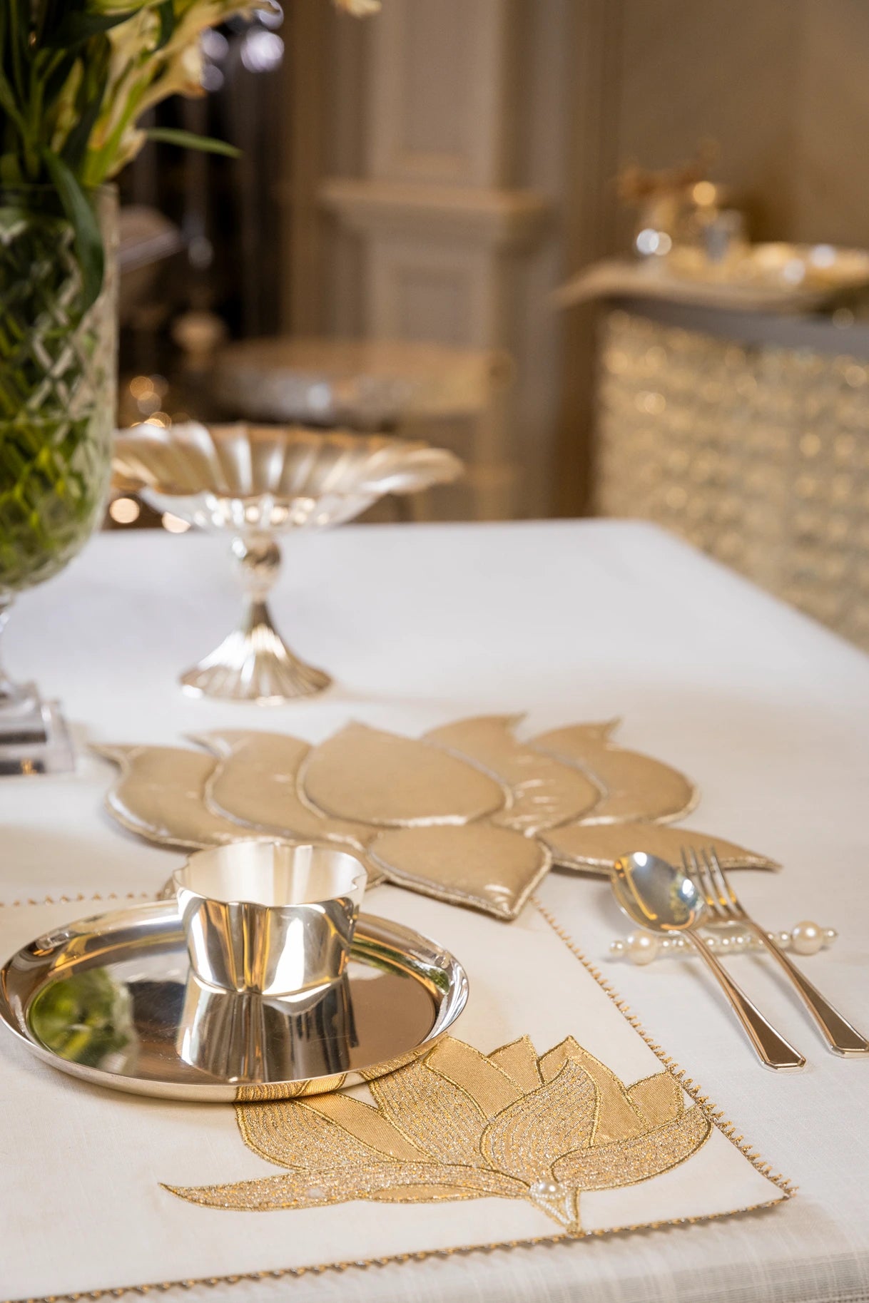 The collection exudes a refined simplicity, featuring pure white table mats and placemats that bring a sense of calm to any setting. Soft, graceful florals gently embellish the fabric, while the timeless lotus, intricately embroidered in golden threads at the corner, adds an elegant touch of opulence.
