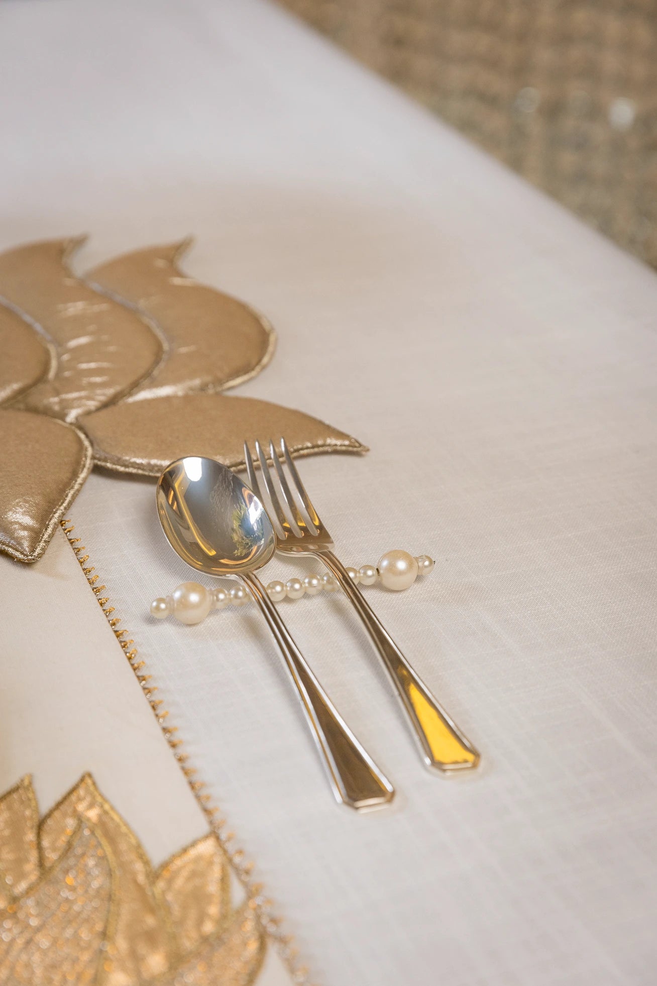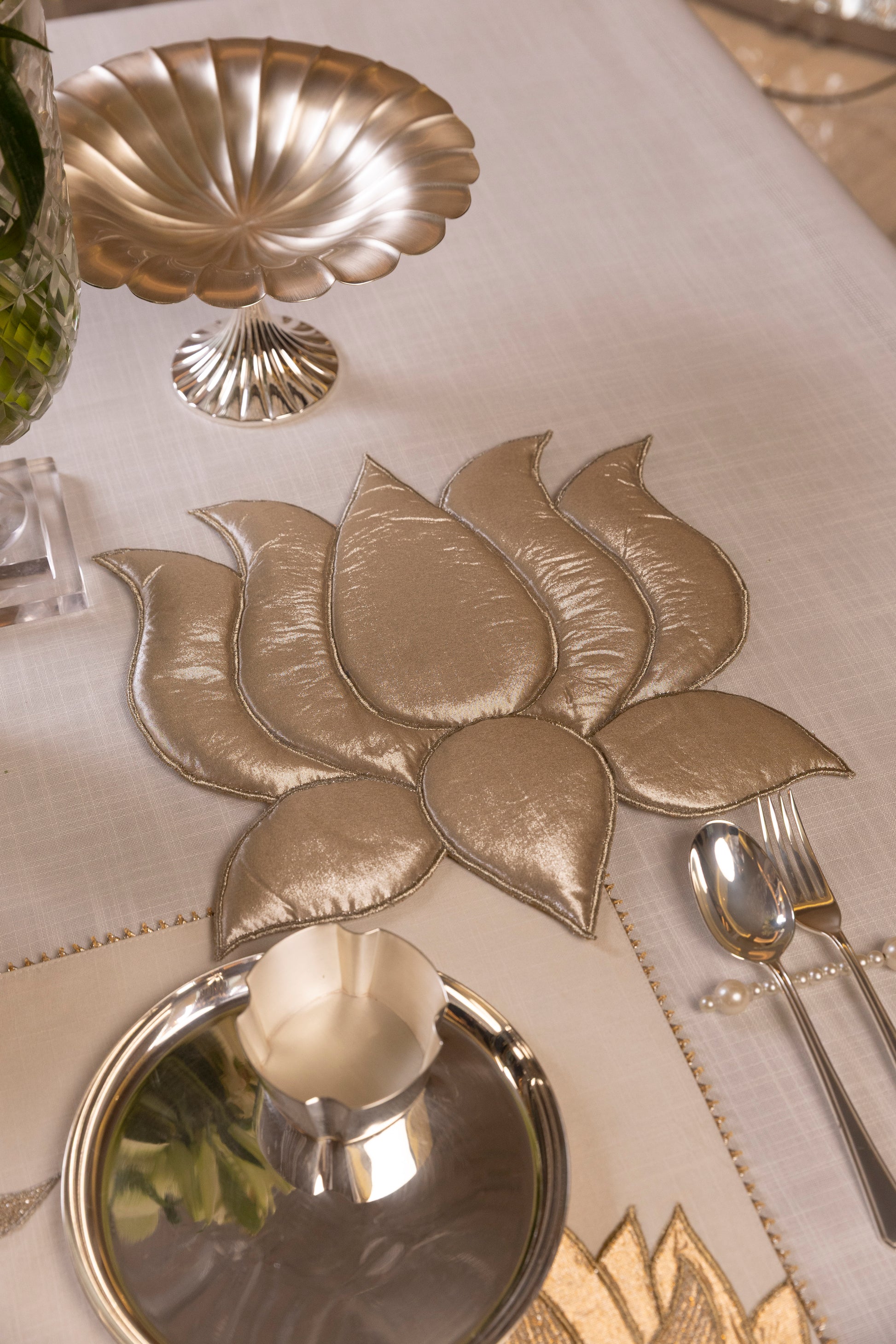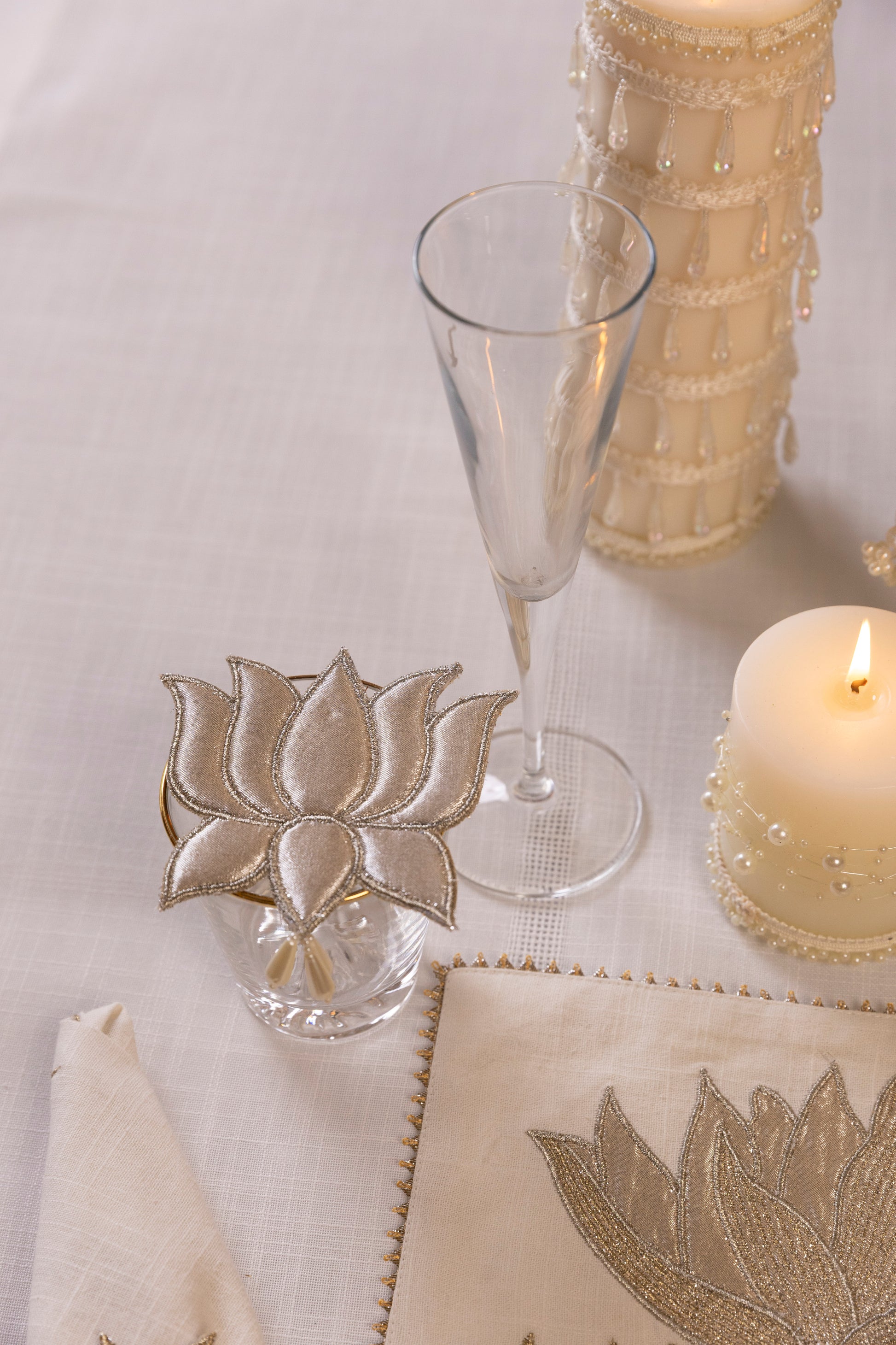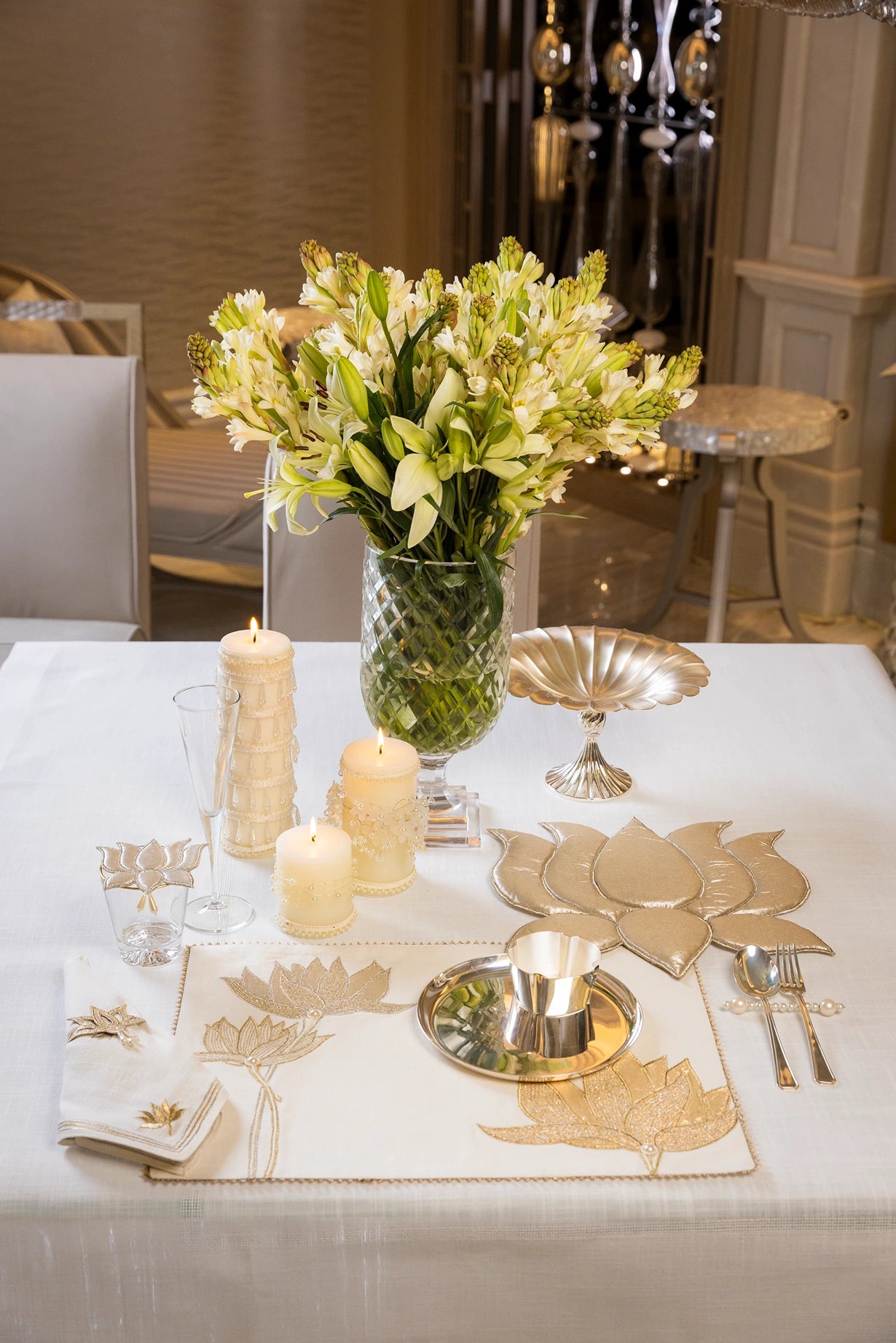 The collection exudes a refined simplicity, featuring pure white table mats and placemats that bring a sense of calm to any setting. Soft, graceful florals gently embellish the fabric, while the timeless lotus, intricately embroidered in golden threads at the corner, adds an elegant touch of opulence.