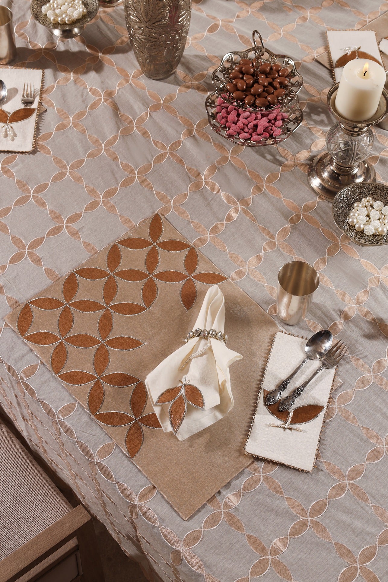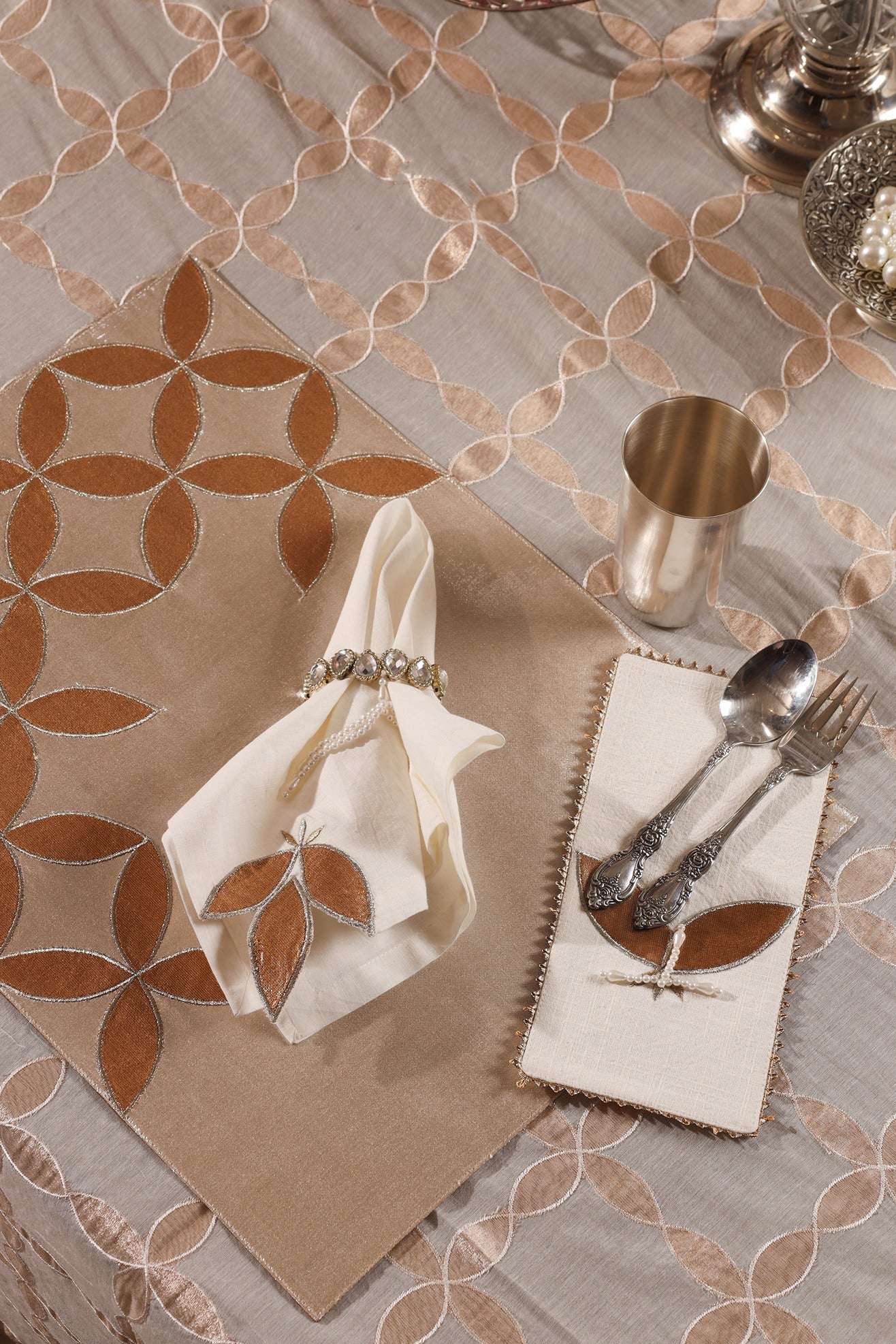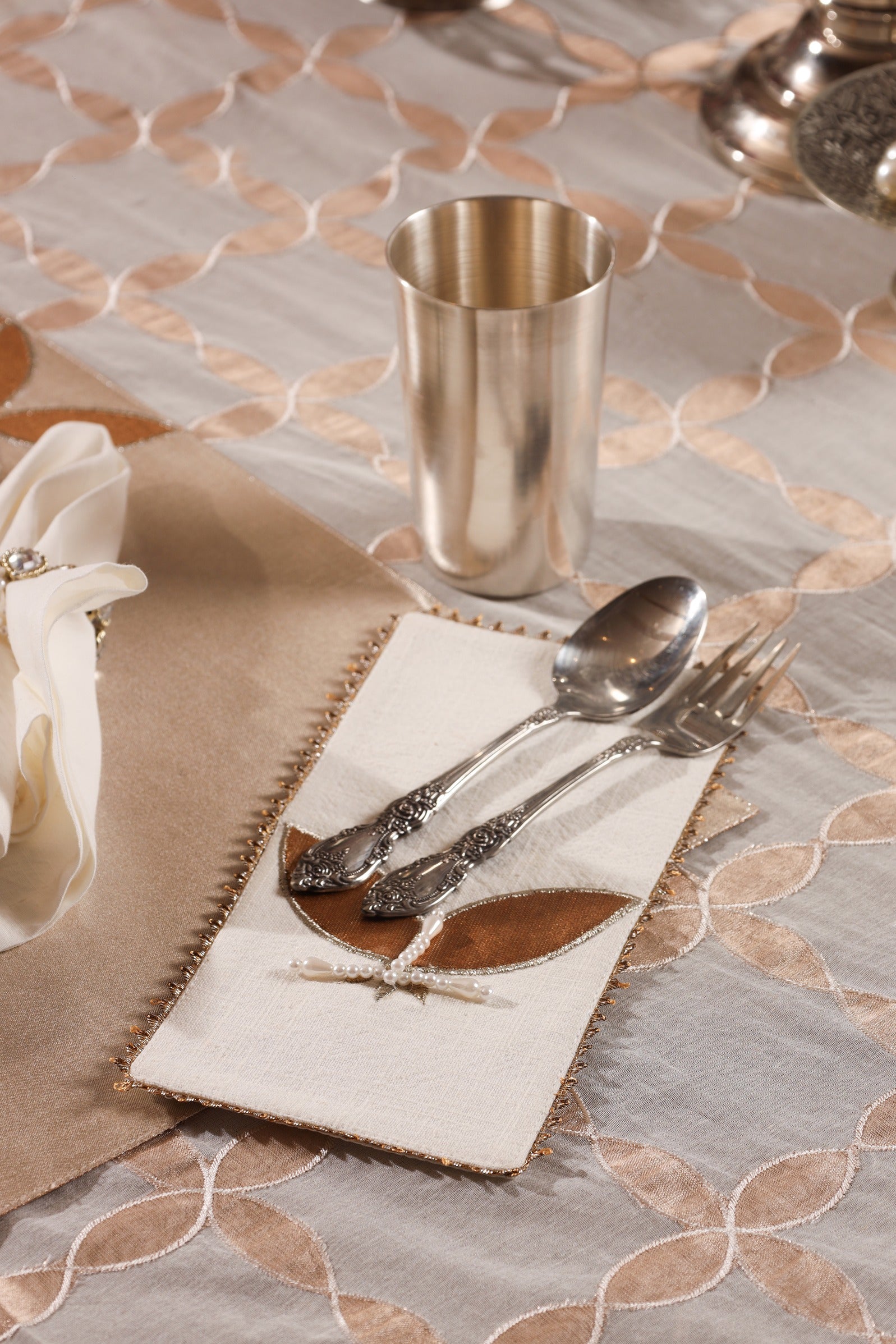 The Leaf Glow collection brings the shimmer of celebration and the grace of nature to your table. Set against a radiant silver metallic base, golden appliquéd leaves gently unfurl across each piece, creating a luminous interplay of texture and light.
