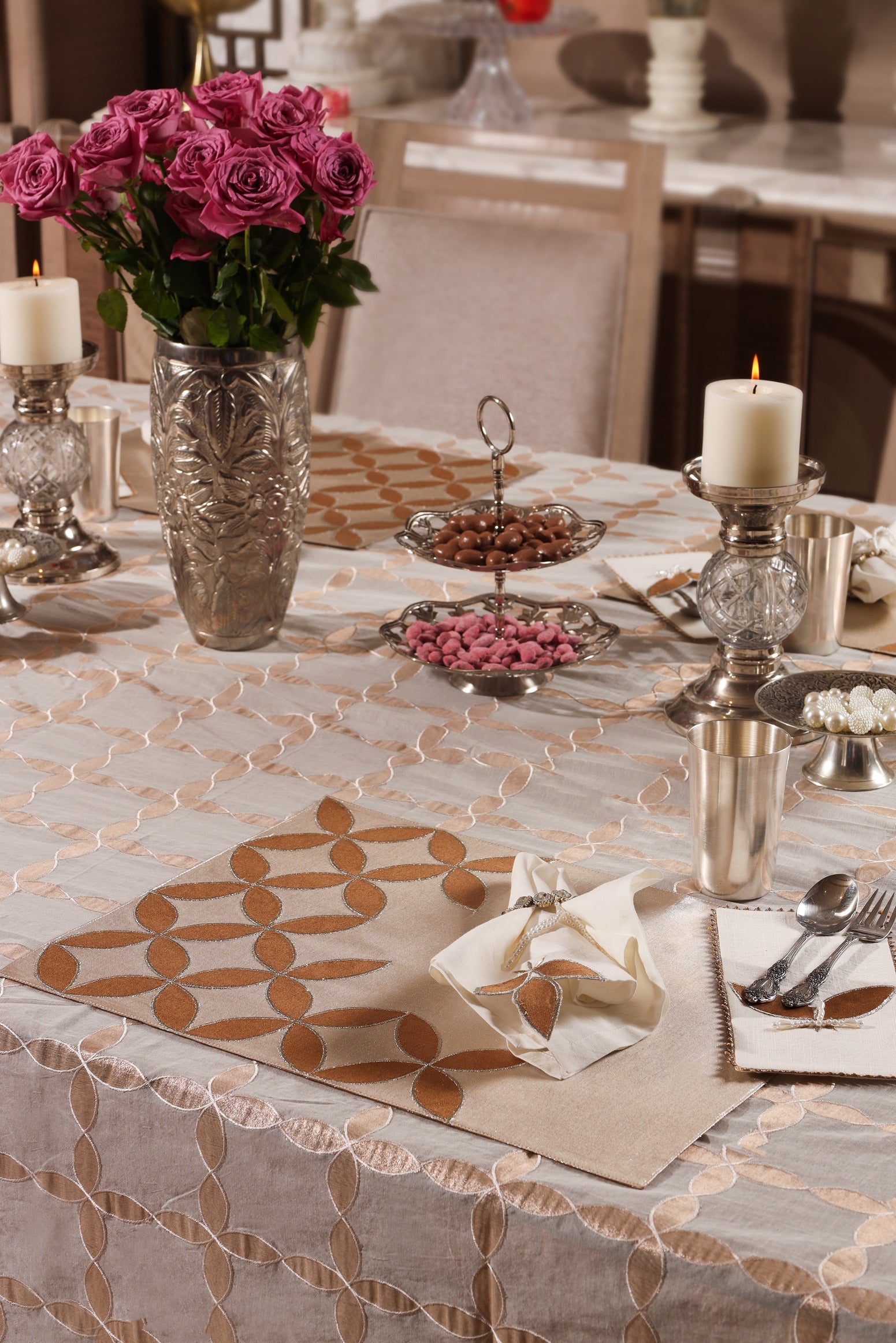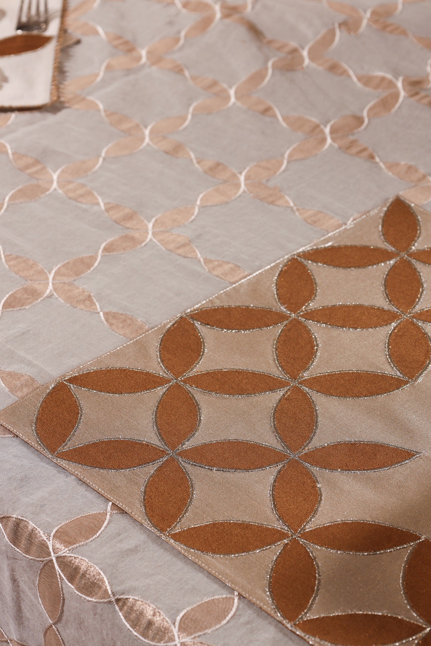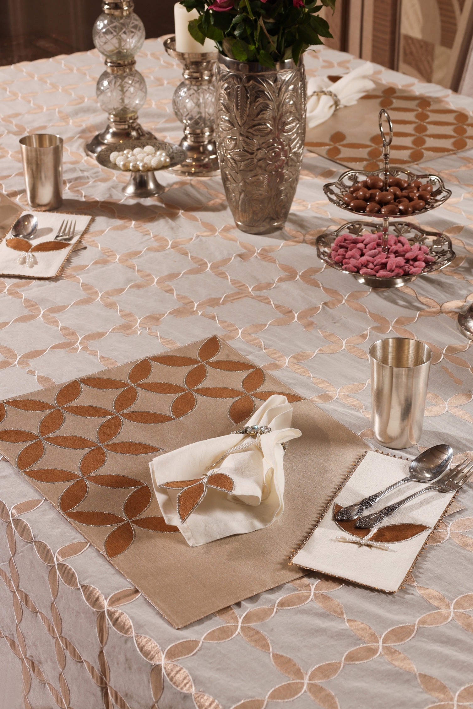 The Leaf Glow collection brings the shimmer of celebration and the grace of nature to your table. Set against a radiant silver metallic base, golden appliquéd leaves gently unfurl across each piece, creating a luminous interplay of texture and light.