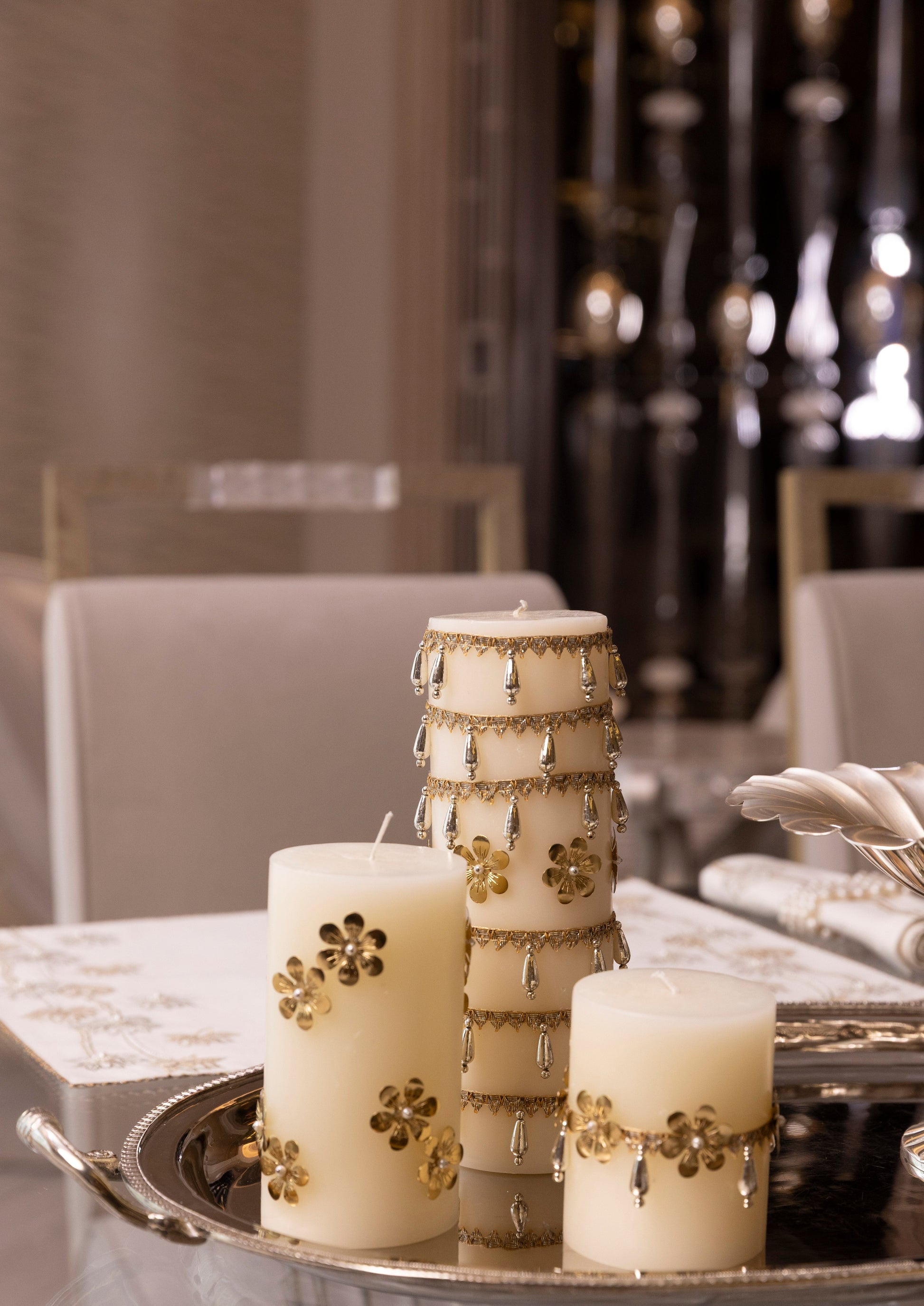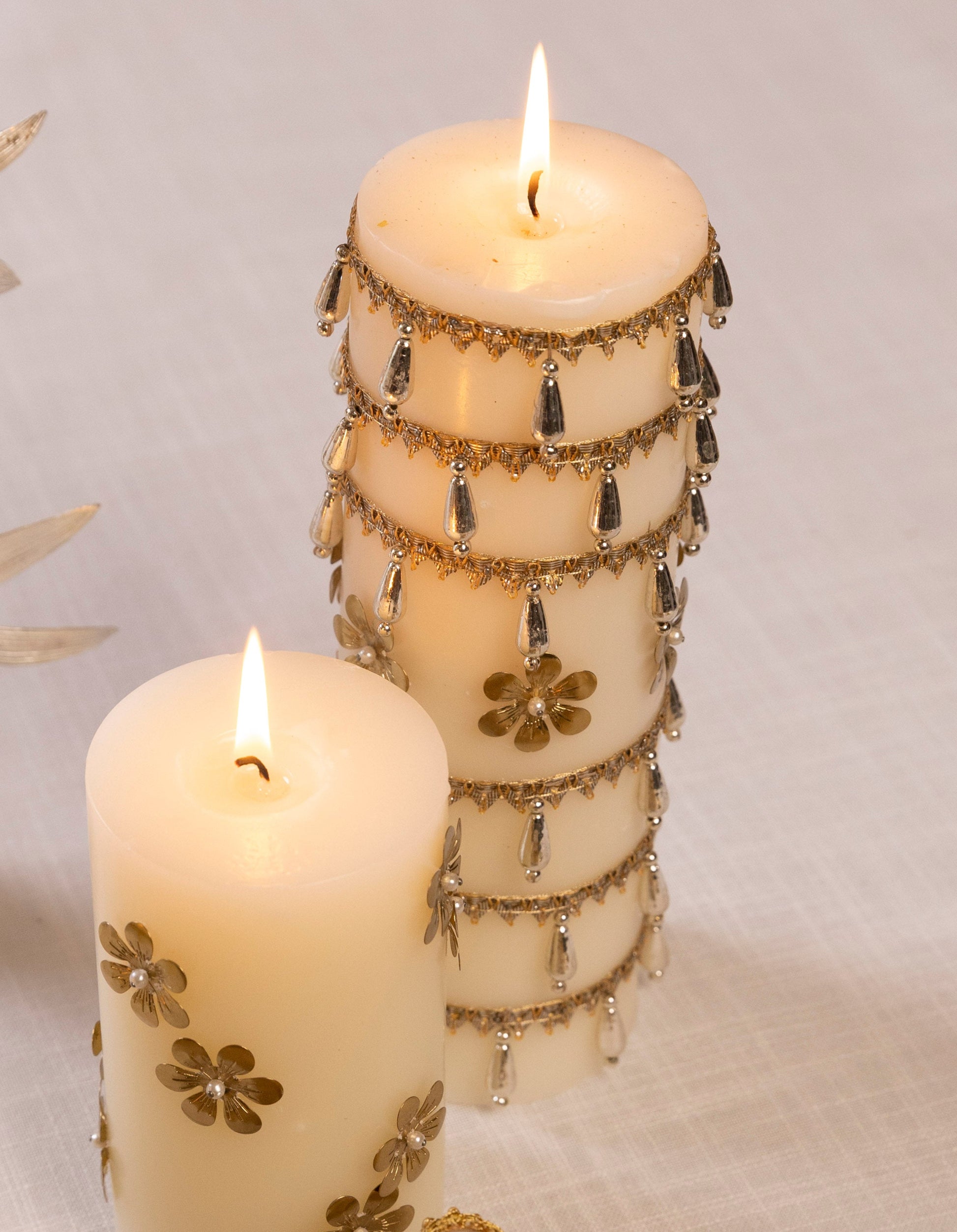 A stunning range of ornamental covers for candles that elevate your decor with a touch of golden luxury. Crafted with intricate golden beads and delicate florals.