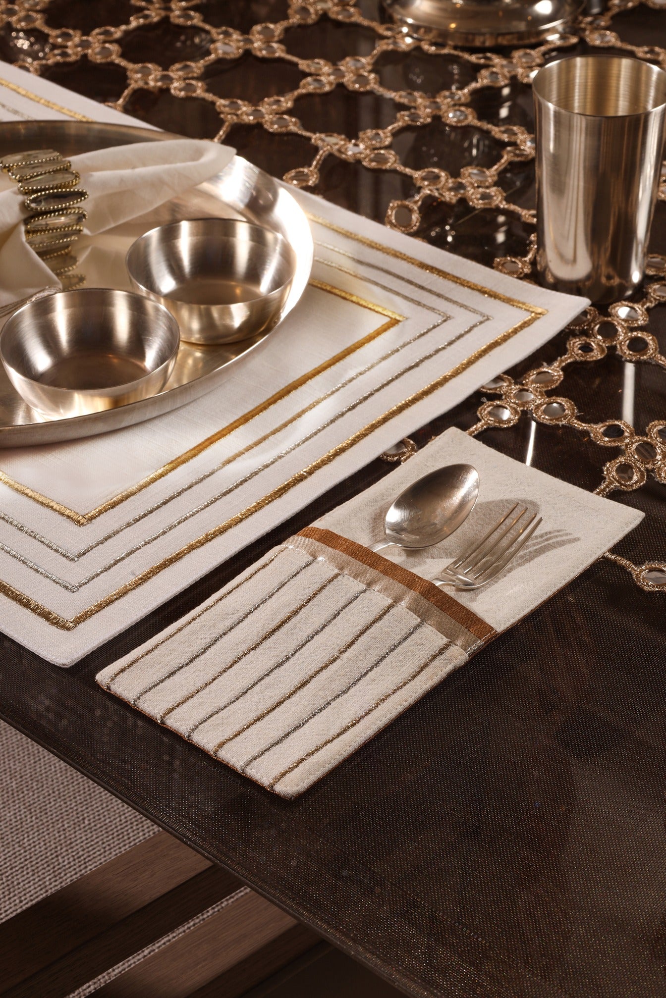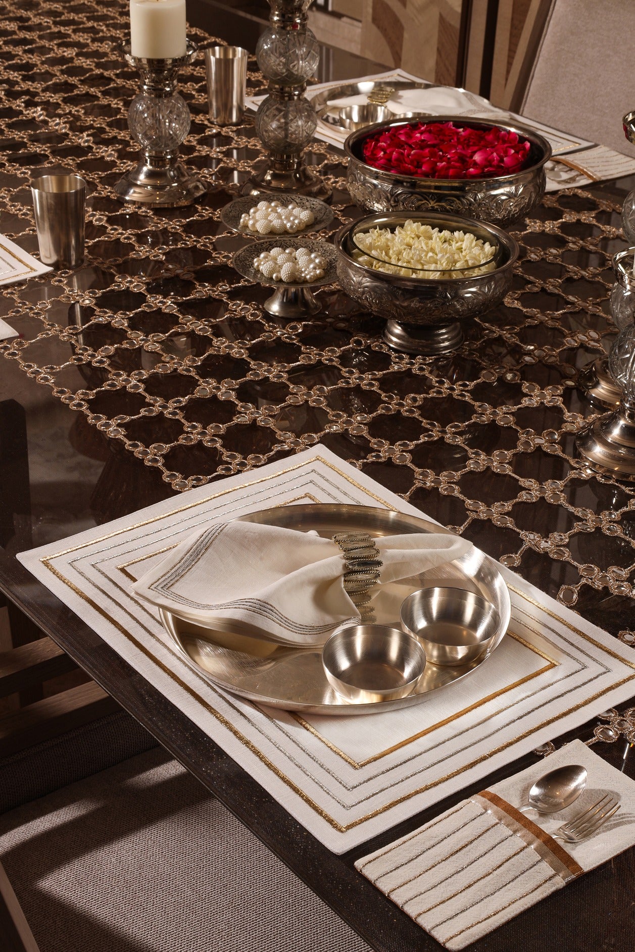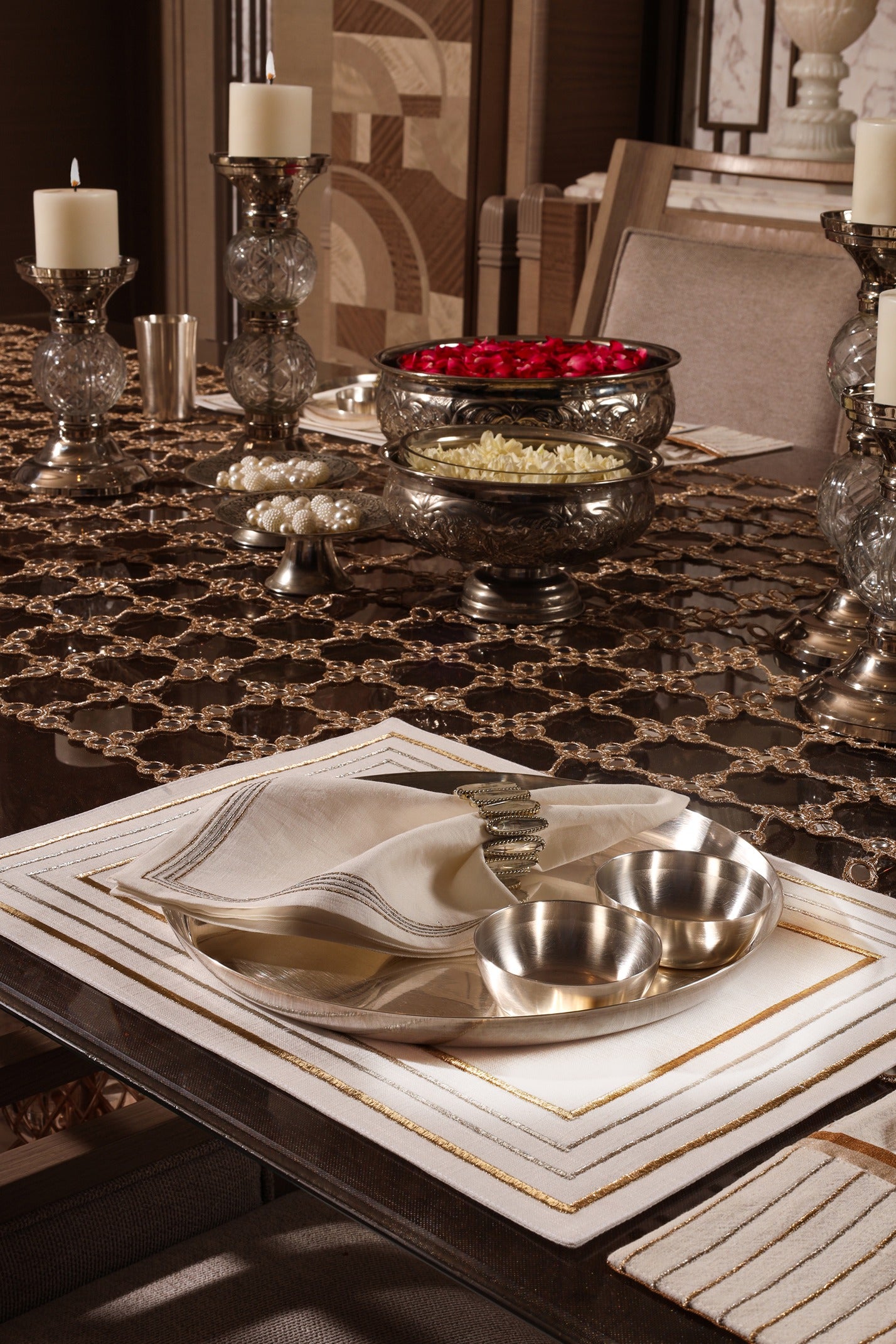 The Luxe Line collection is a celebration of minimalism touched with opulence. Crafted in cream cotton-linen, each piece is bordered with alternating gold and silver metallic lines—two of each—creating a perfectly balanced design that’s both subtle and striking.