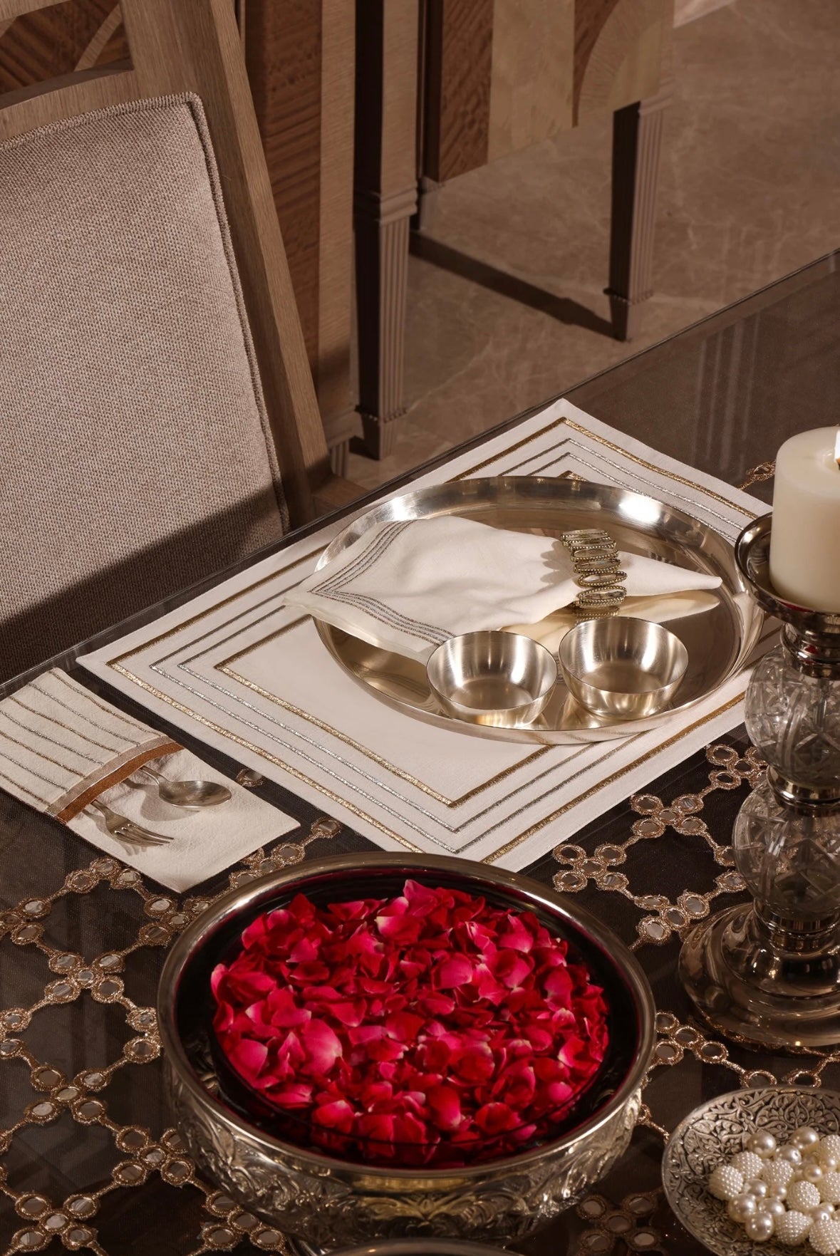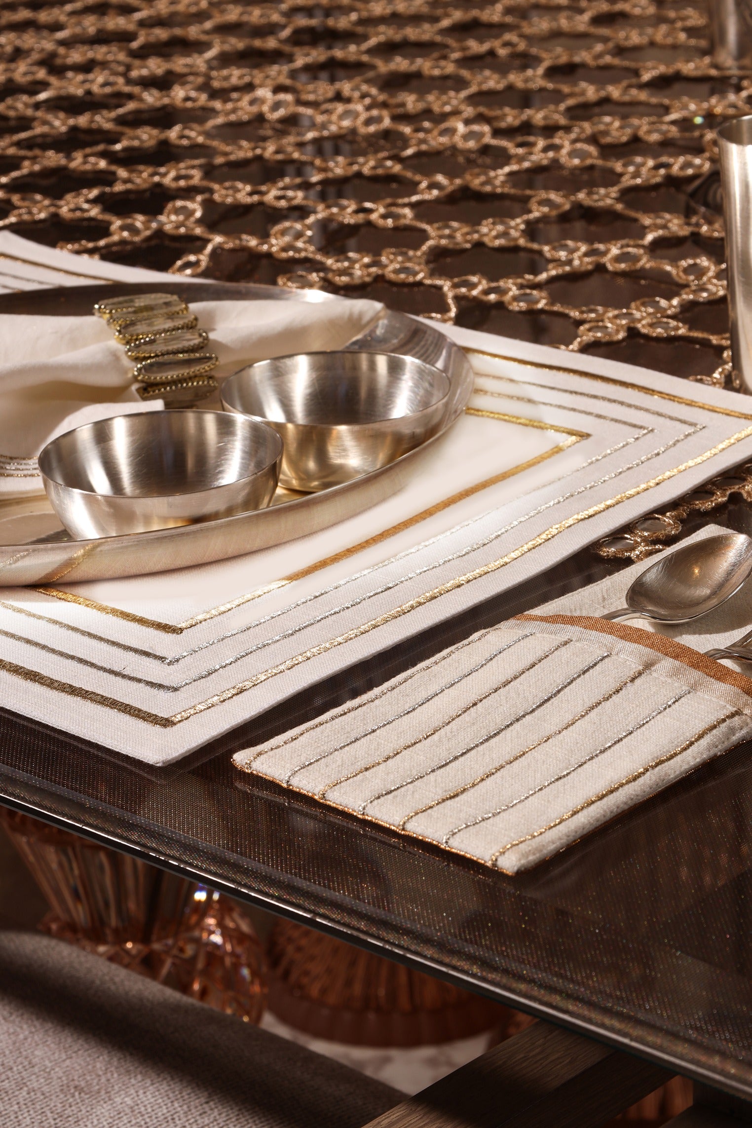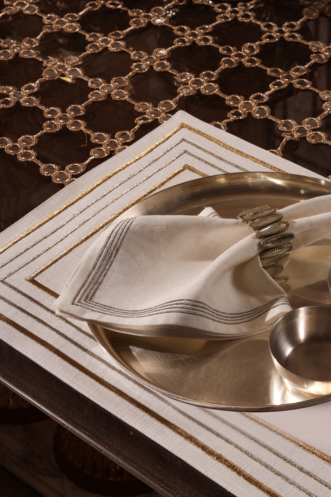 The Luxe Line collection is a celebration of minimalism touched with opulence. Crafted in cream cotton-linen, each piece is bordered with alternating gold and silver metallic lines—two of each—creating a perfectly balanced design that’s both subtle and striking.