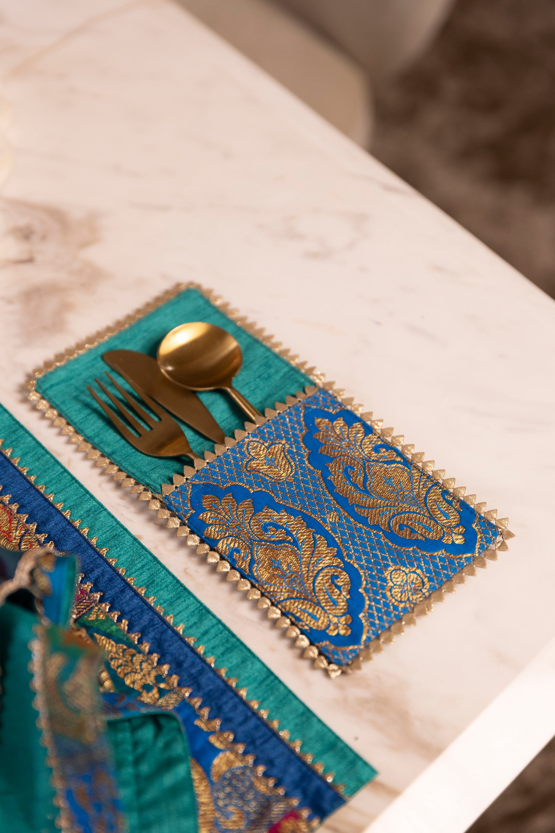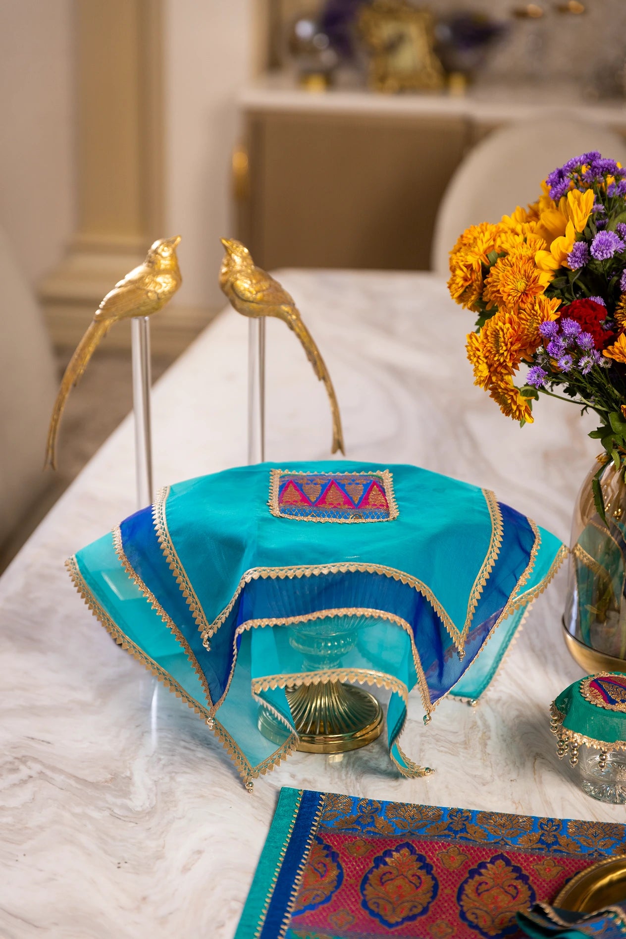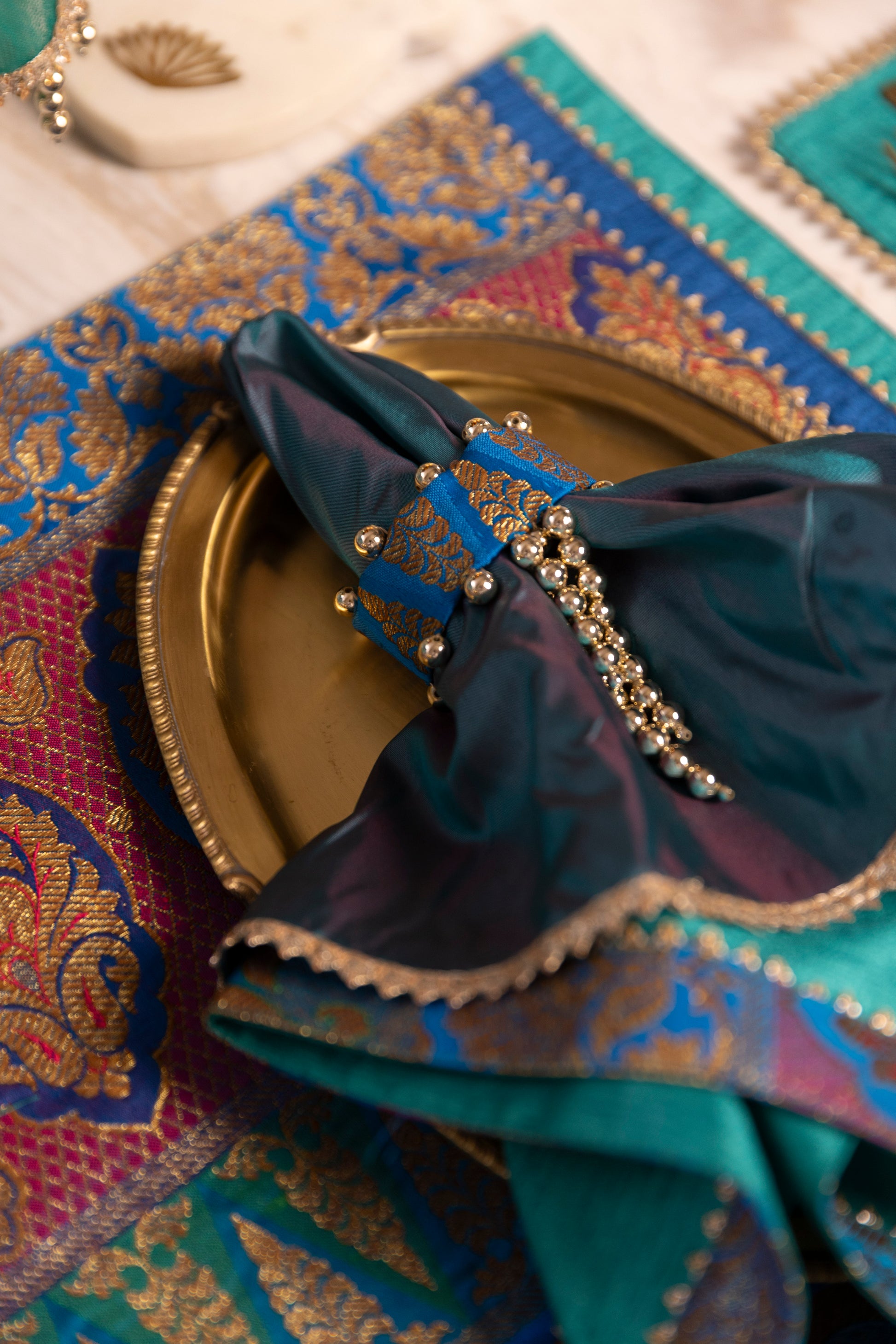 The Majestic Feather collection is a tribute to regal elegance and timeless sophistication. Crafted in shades of deep blue, each piece is adorned with golden beads and glistening golden threads.