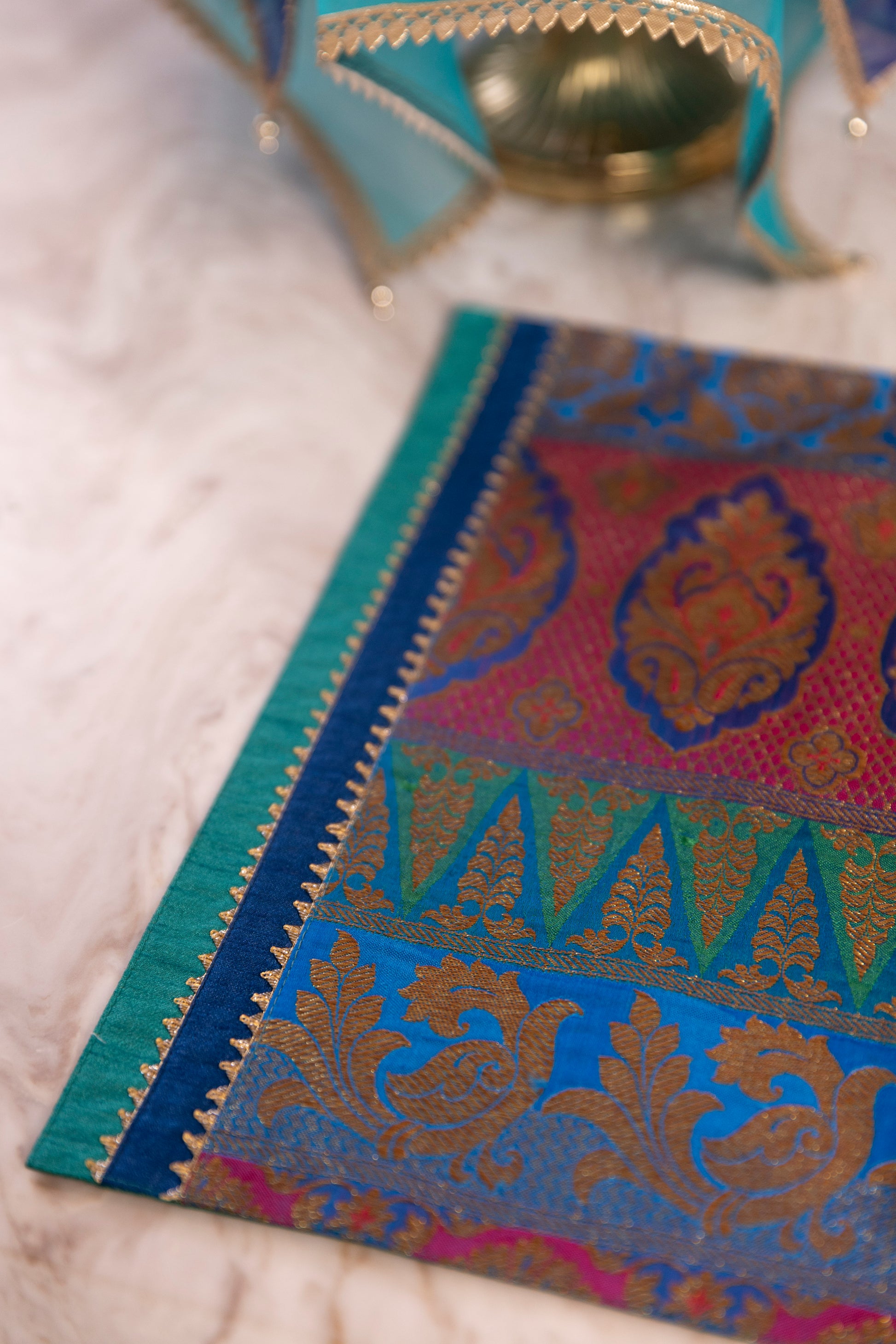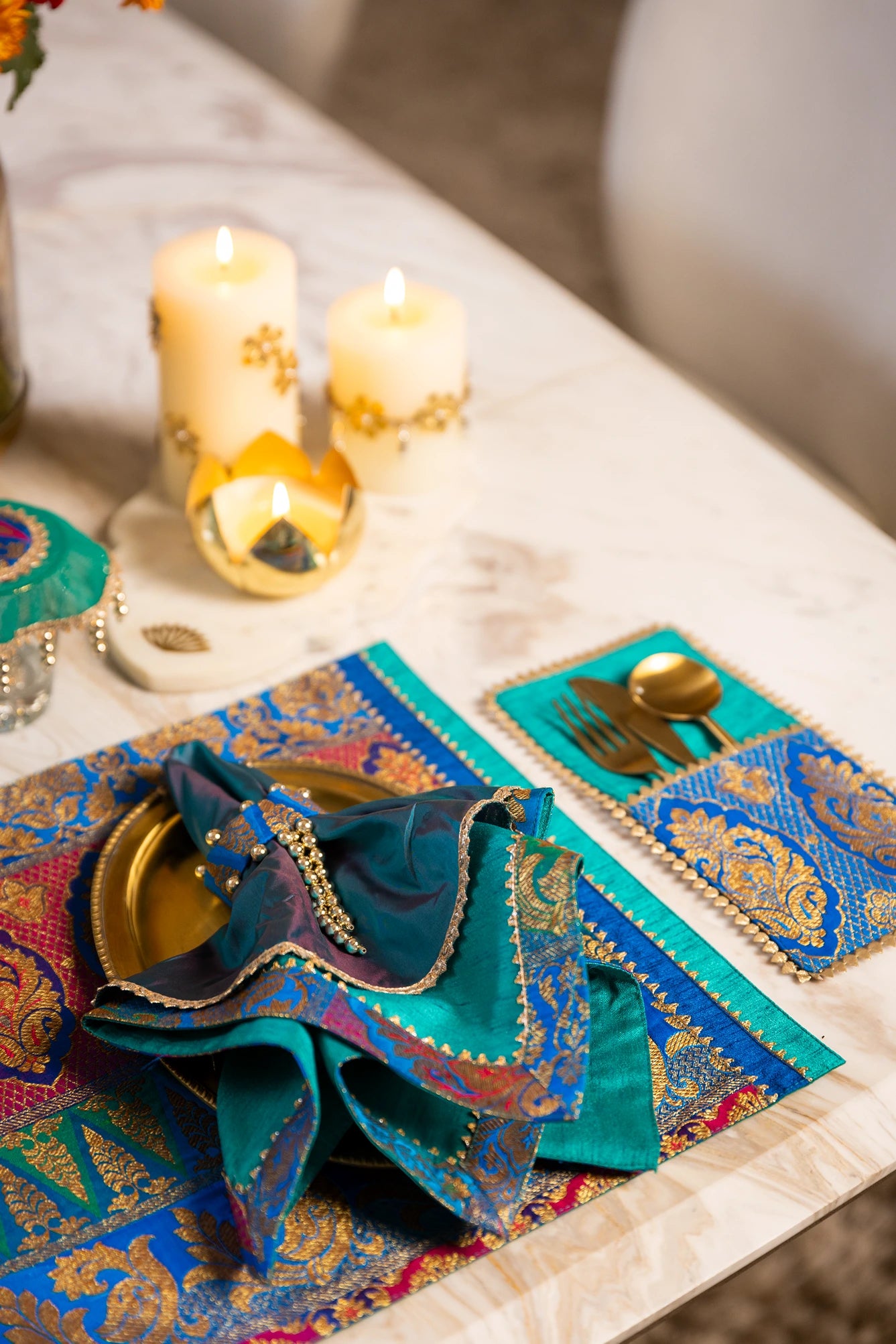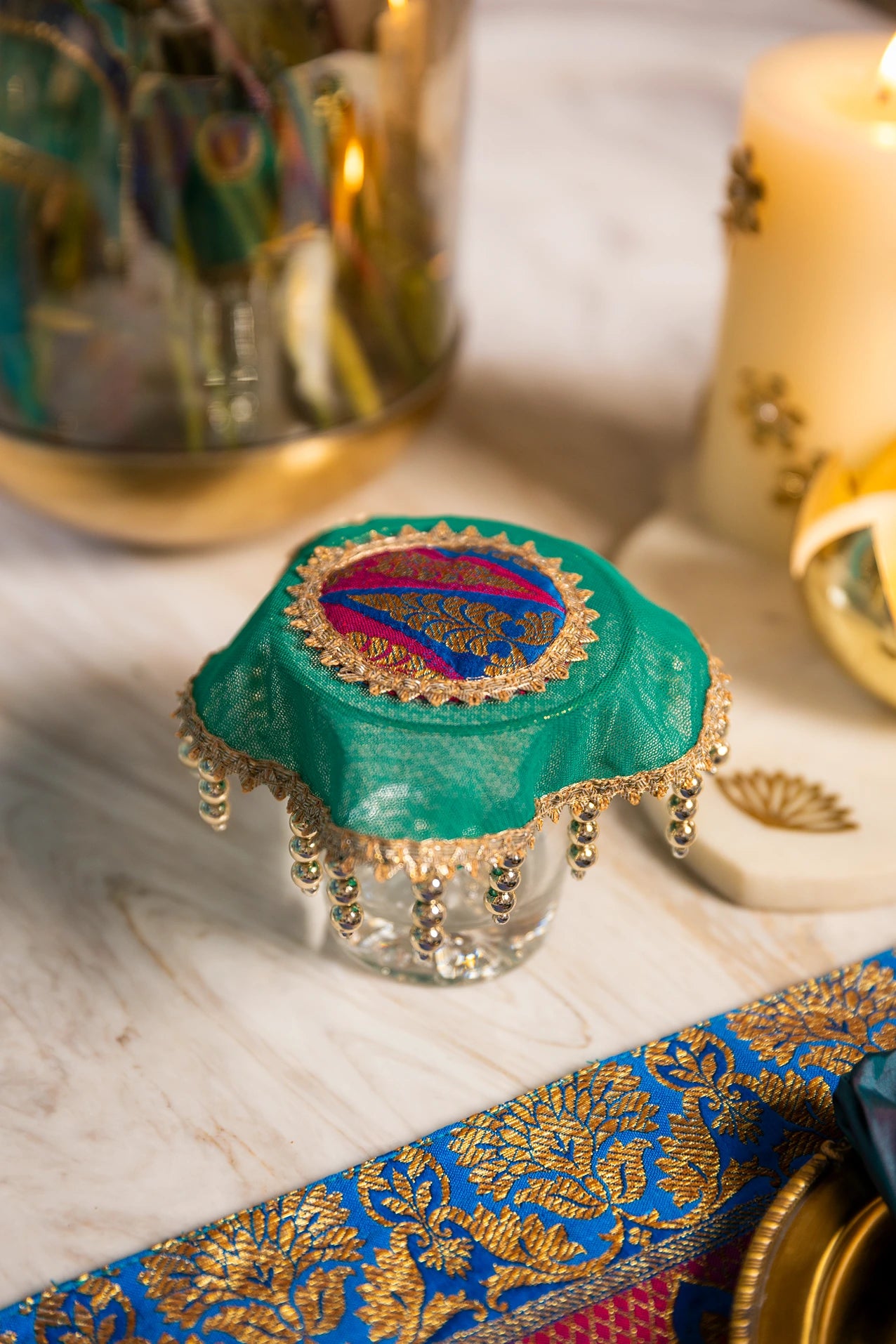 The Majestic Feather collection is a tribute to regal elegance and timeless sophistication. Crafted in shades of deep blue, each piece is adorned with golden beads and glistening golden threads.