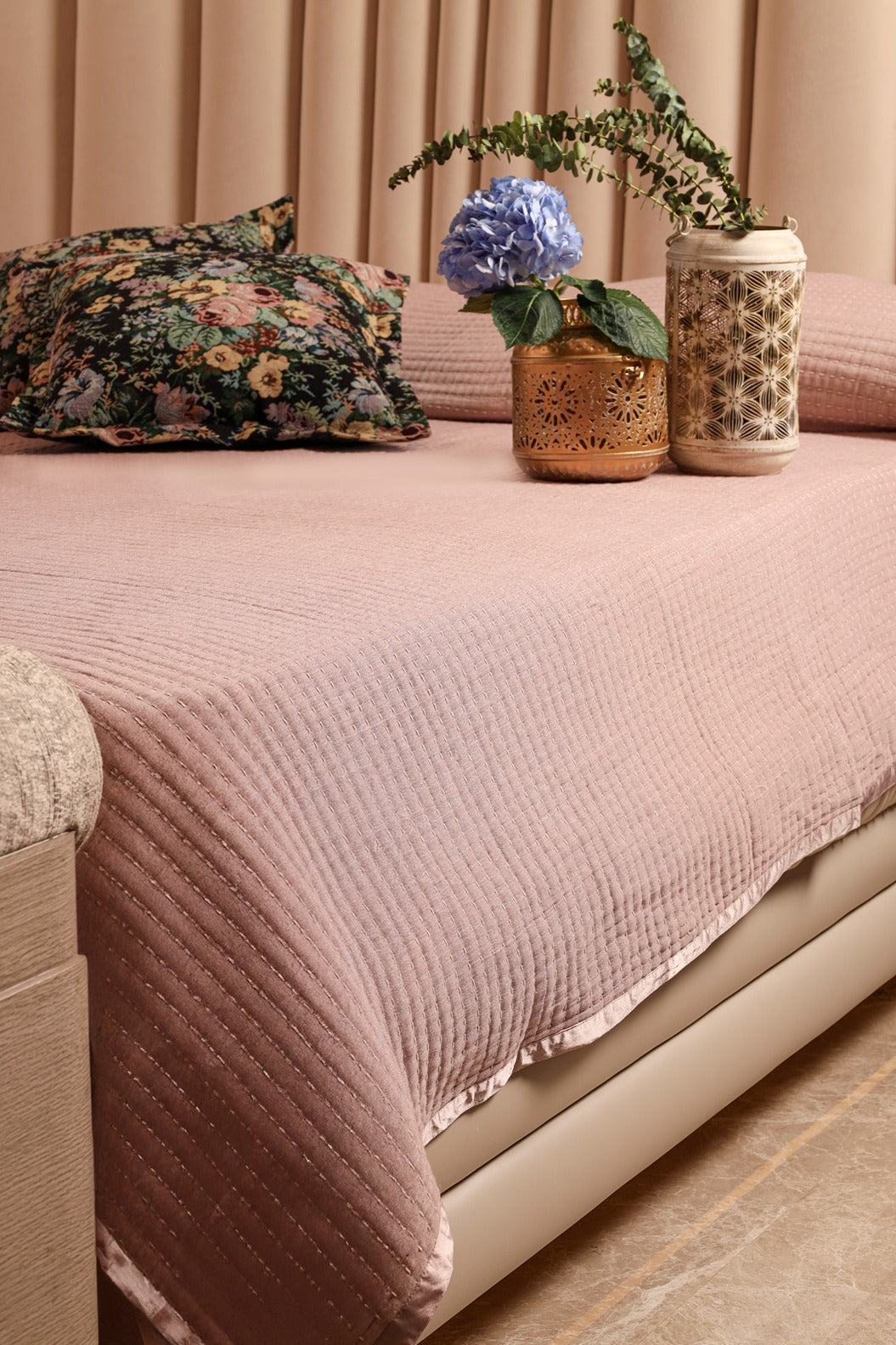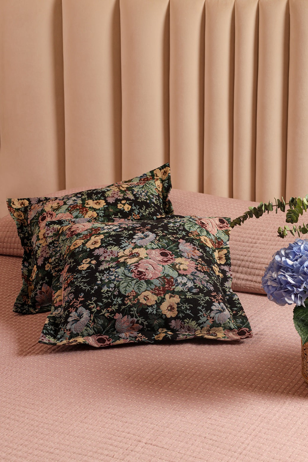 Inspired by the delicate beauty of a blooming garden, Petal brings a touch of floral romance to your bedroom. The soft pink bedcover exudes understated elegance, complemented by two woven floral jacquard cushions included in the set, adding texture and sophistication. This set includes :