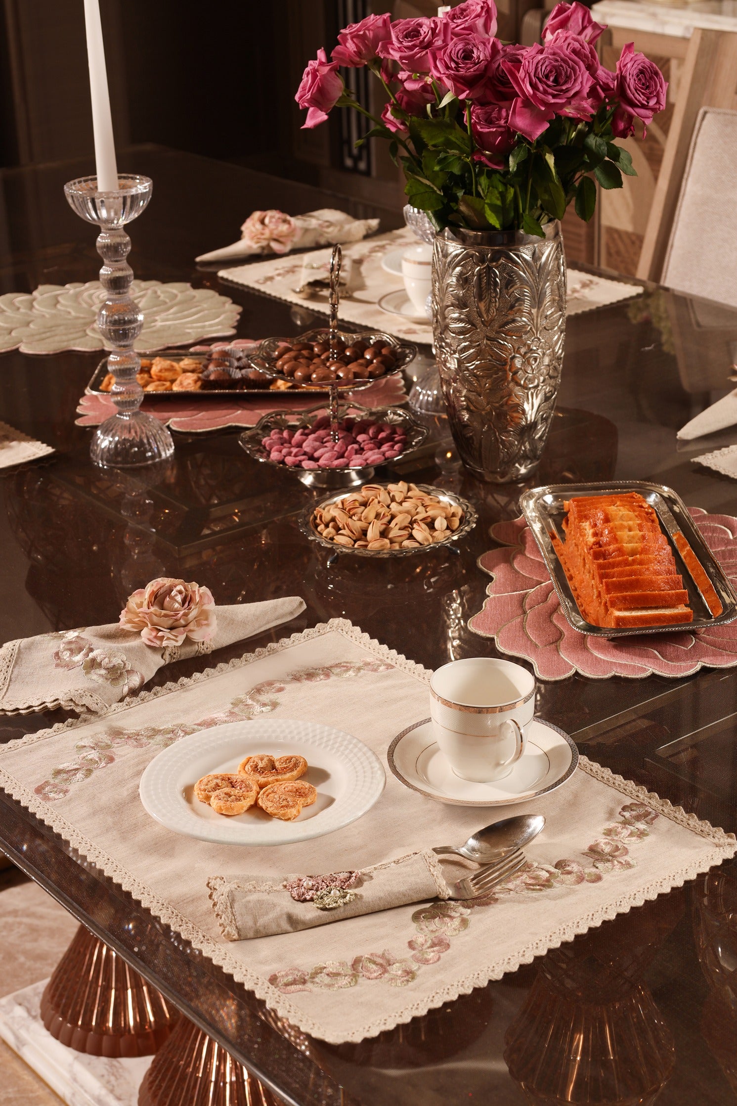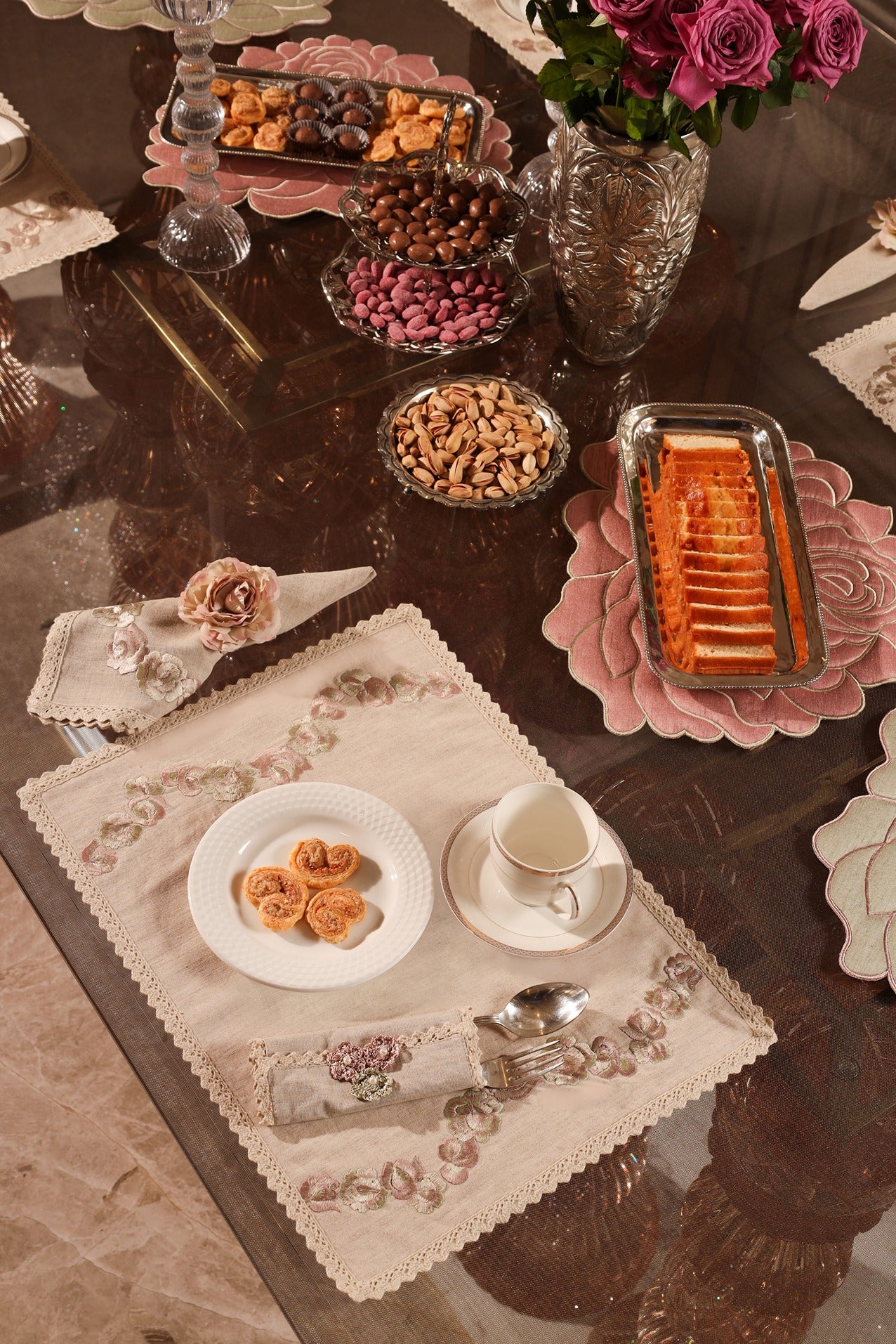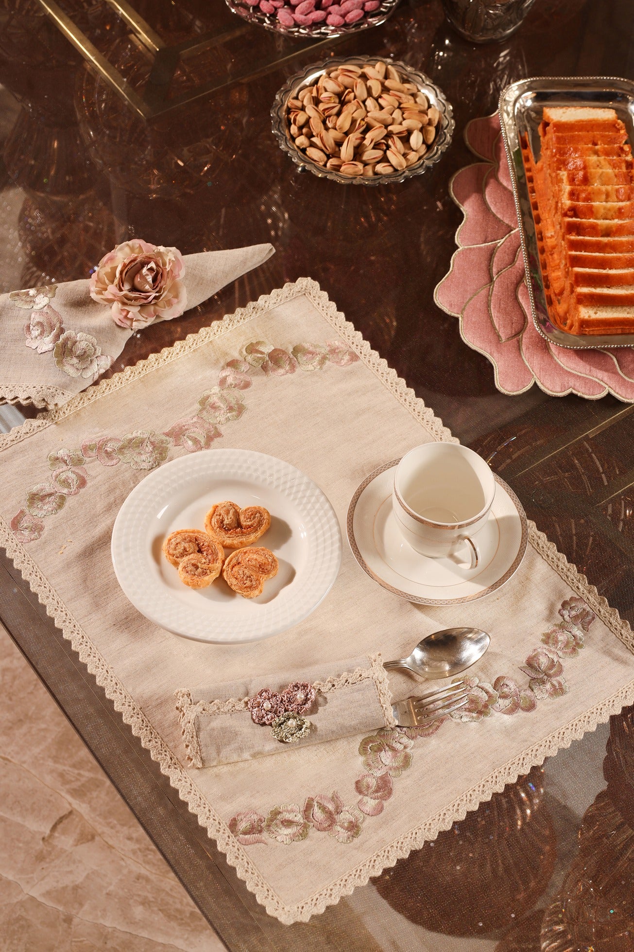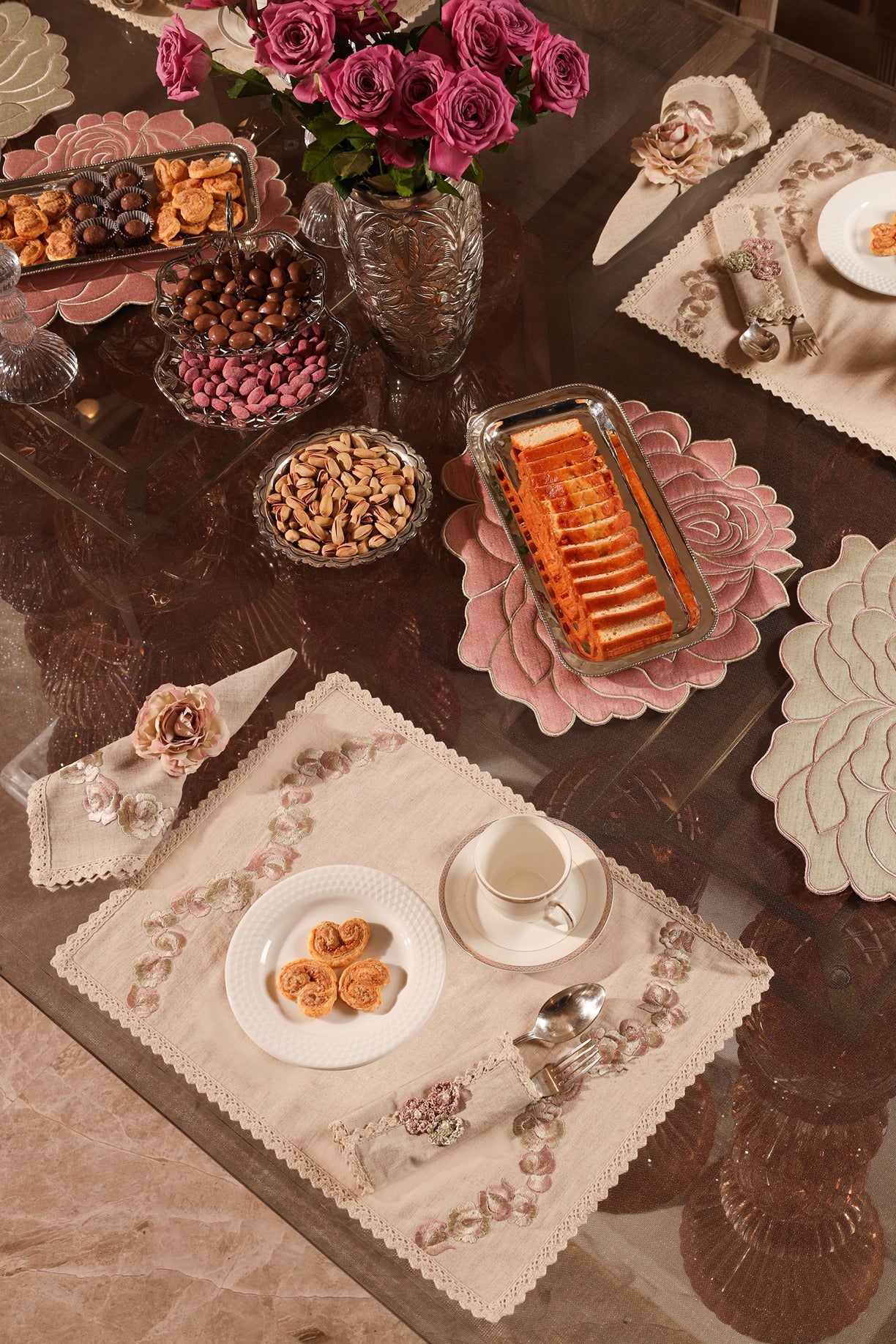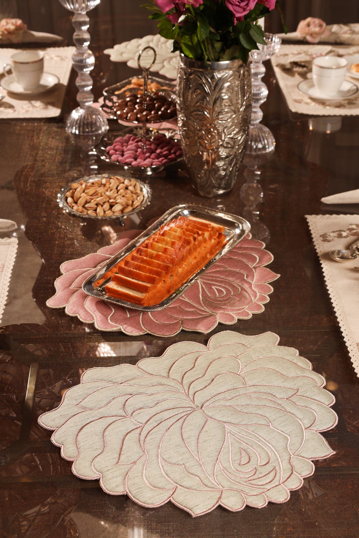 The Soft Bloom collection is a delicate ode to quiet beauty and refined craftsmanship. Set on a canvas of soft beige linen, graceful roses bloom in shades of blush pink and sage green embroidery—gentle and timeless.