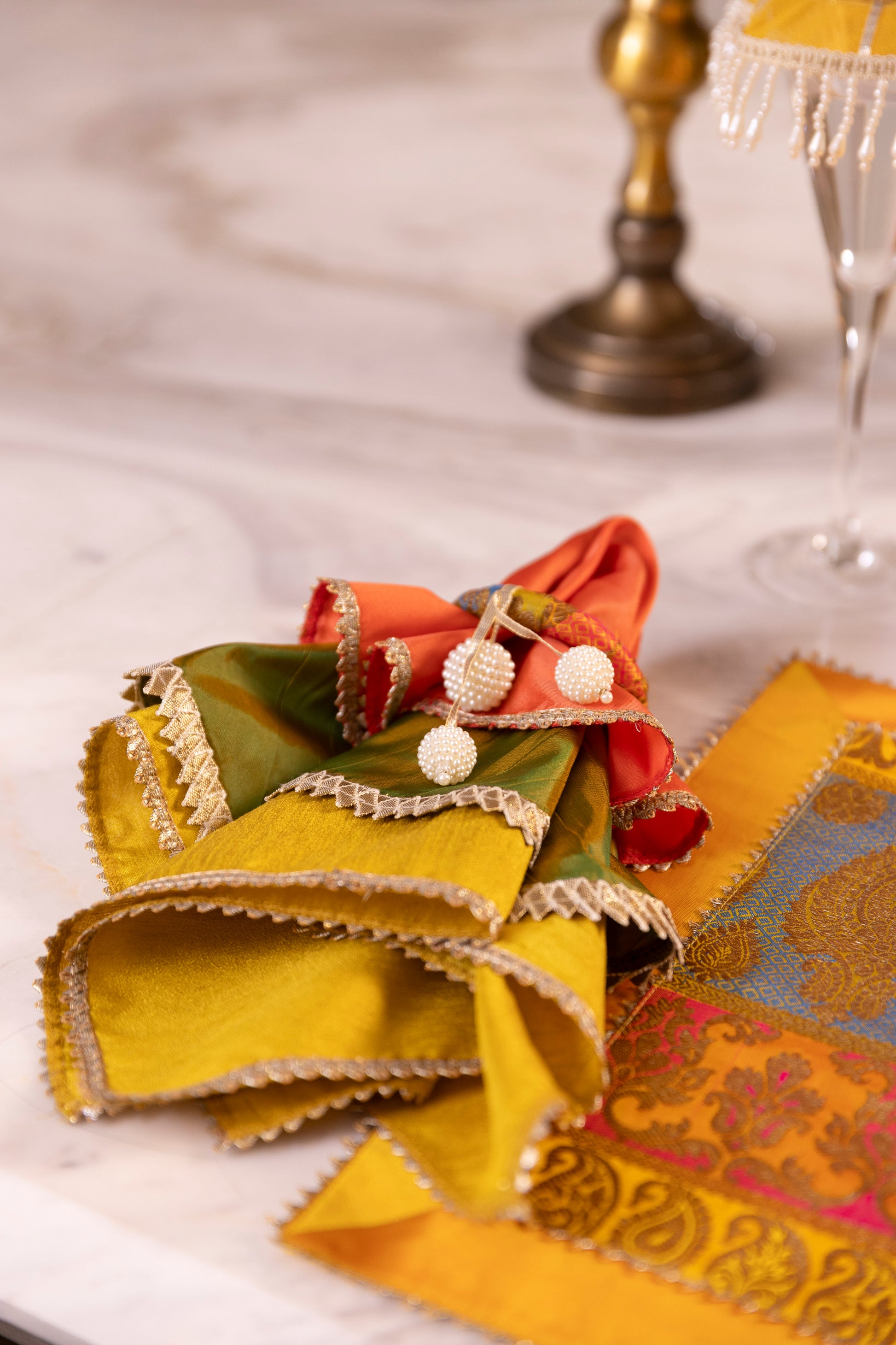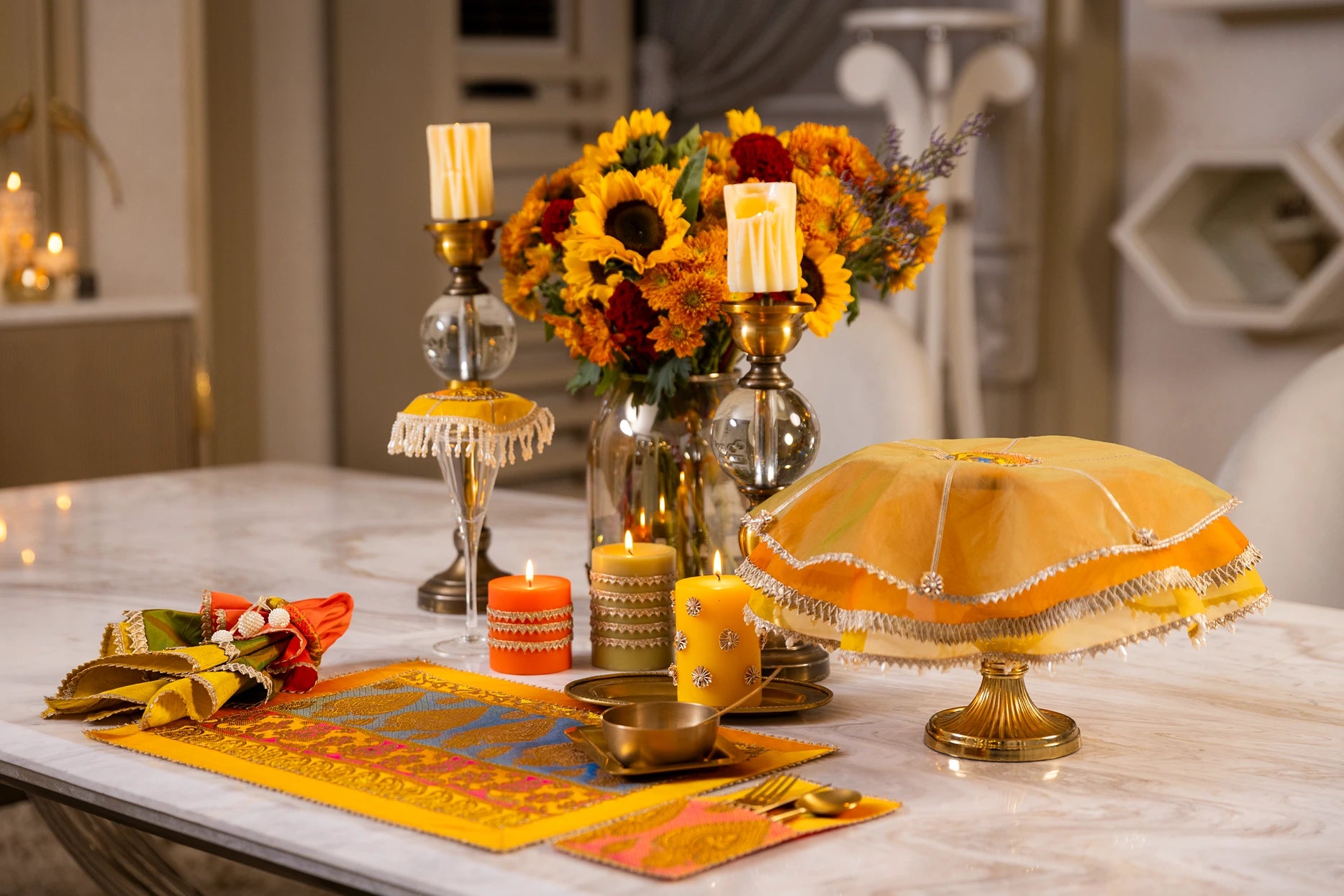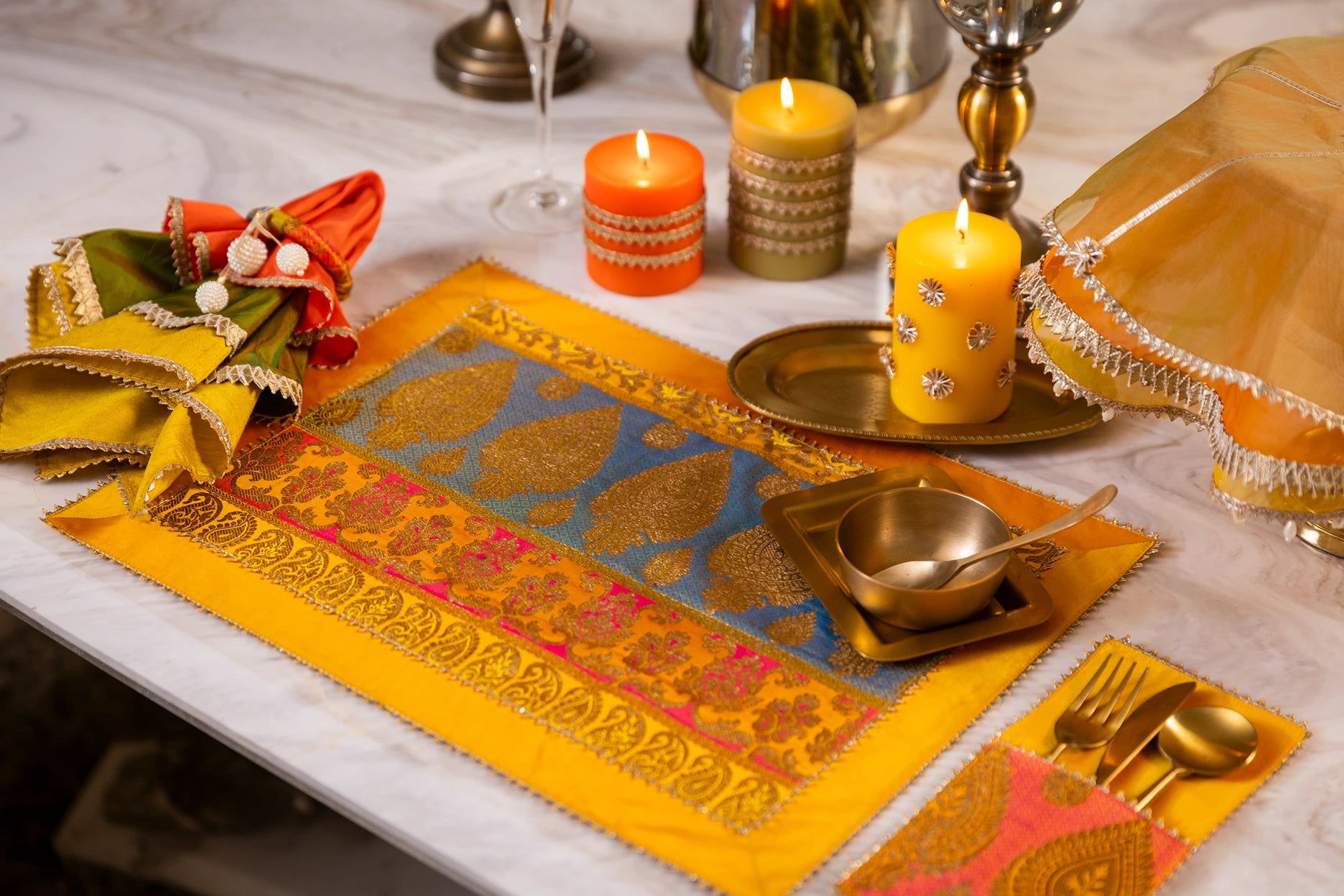 The Sparkling Saffron collection draws inspiration from the vibrant hue that heralds the beginning of all celebrations. True to its traditional roots, each piece is intricately woven with golden thread motifs that beautifully complement the rich saffron tones, bringing a sense of warmth and harmony to your home.