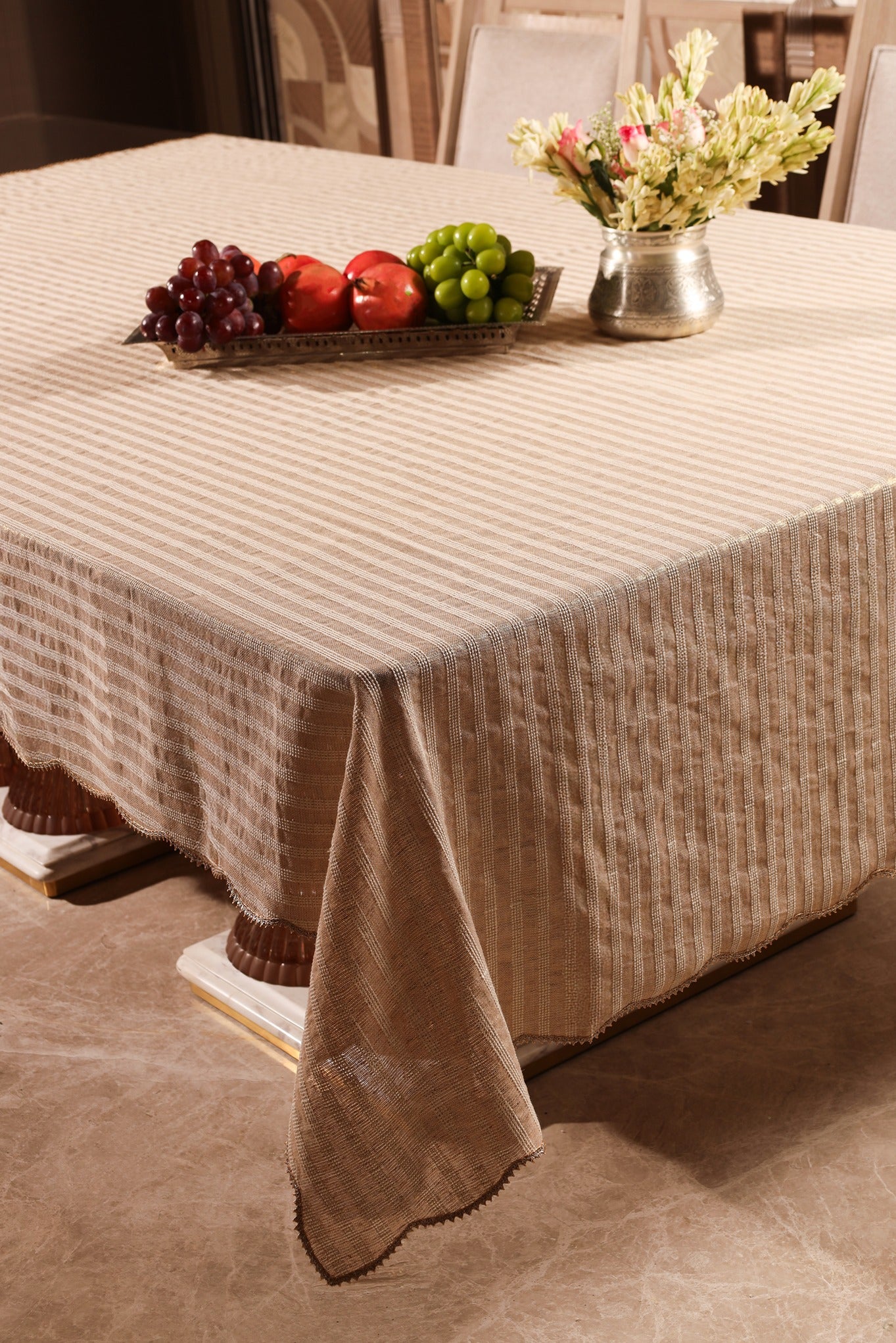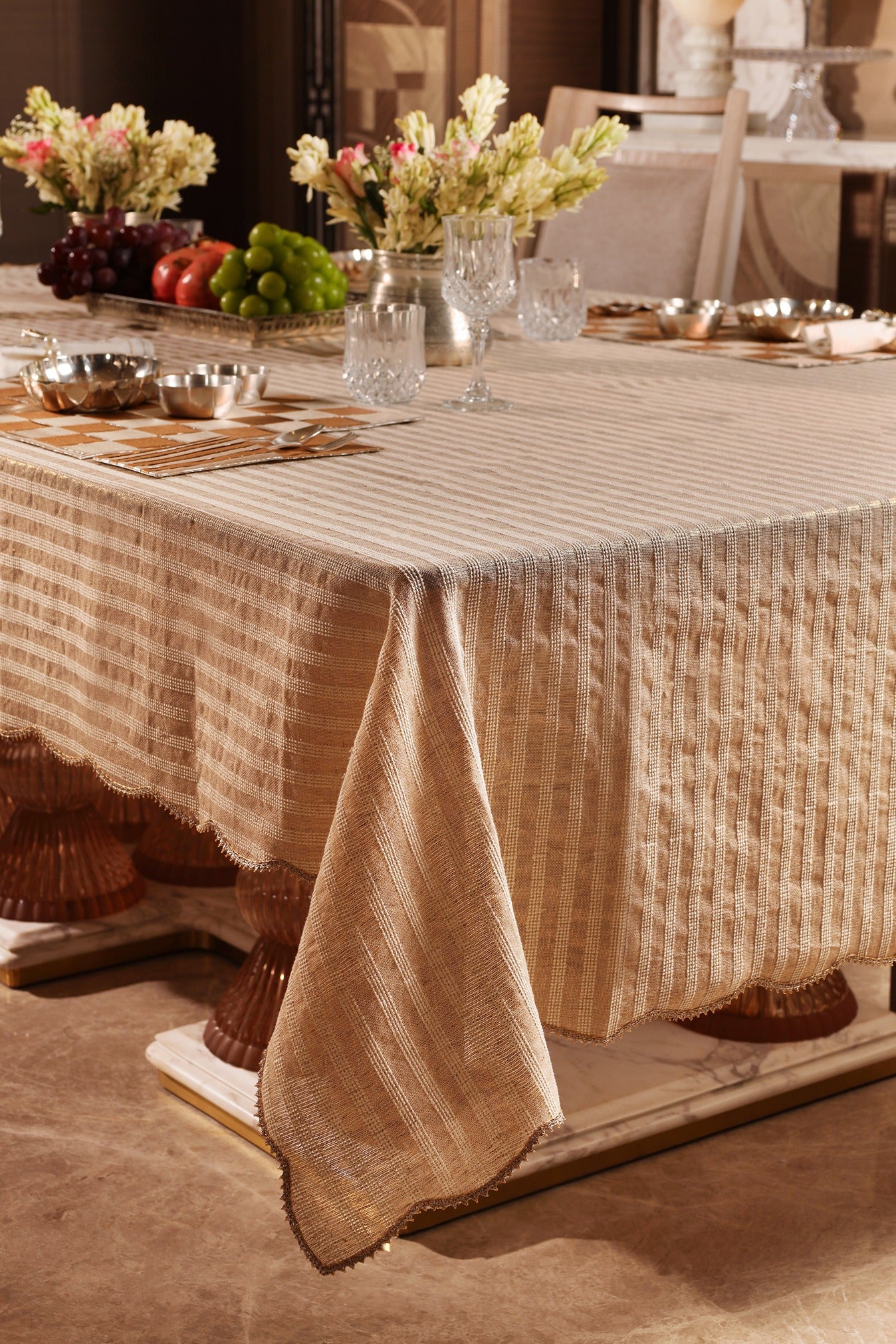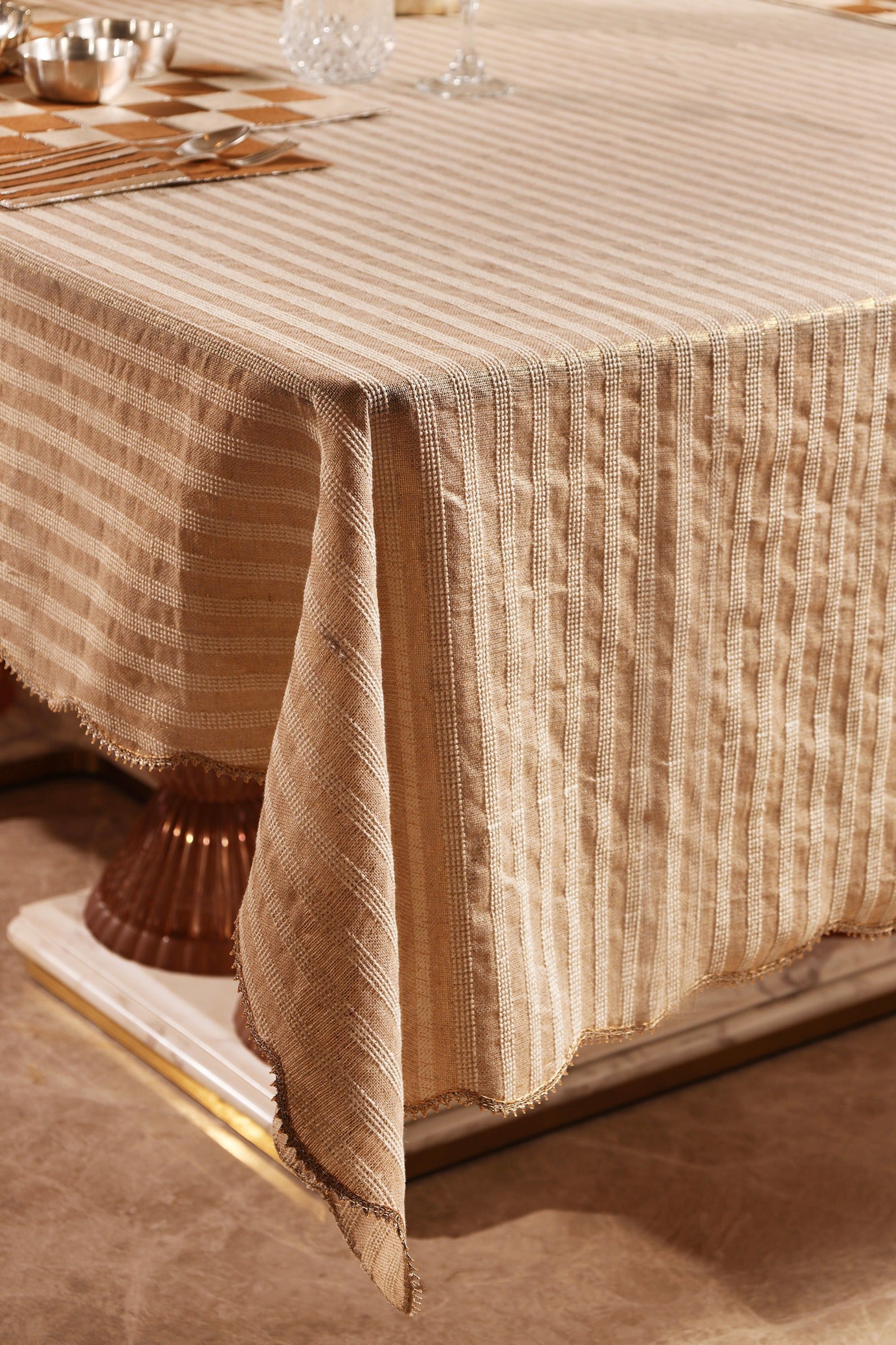 Stravia features sophisticated linear patterns in gold foiled on jute linen. Its structured elegance adds a contemporary, luxurious touch to any dining or living setting. Designed for those who appreciate modern geometry fused with classic craftsmanship, Stravia effortlessly enhances your tablescape with style and grace.