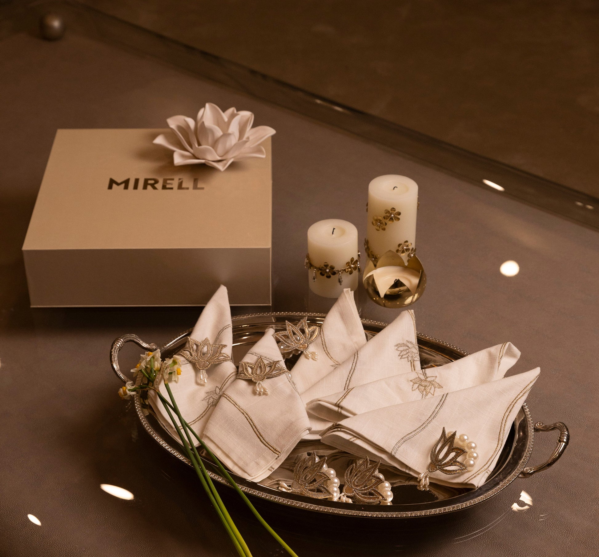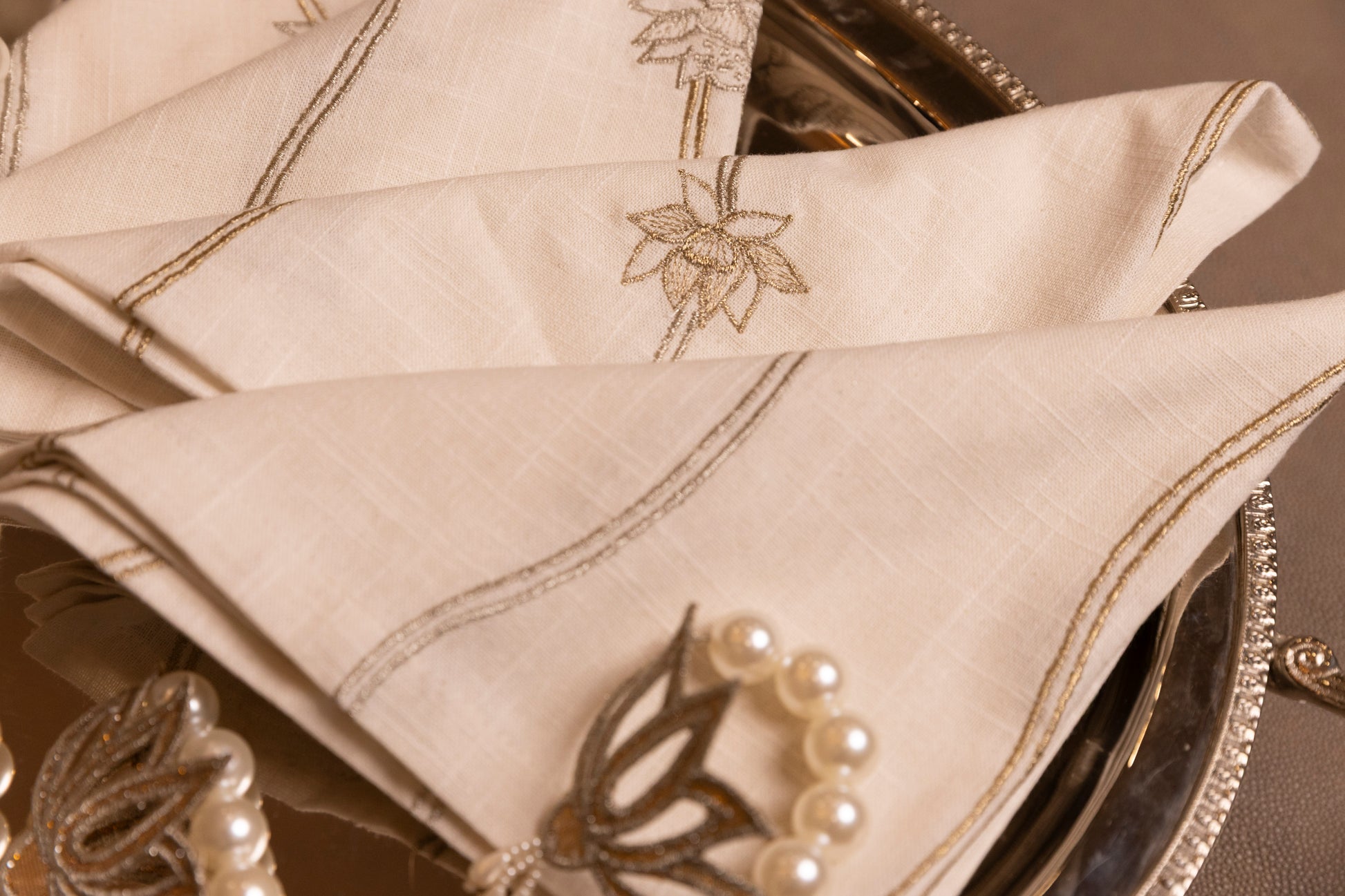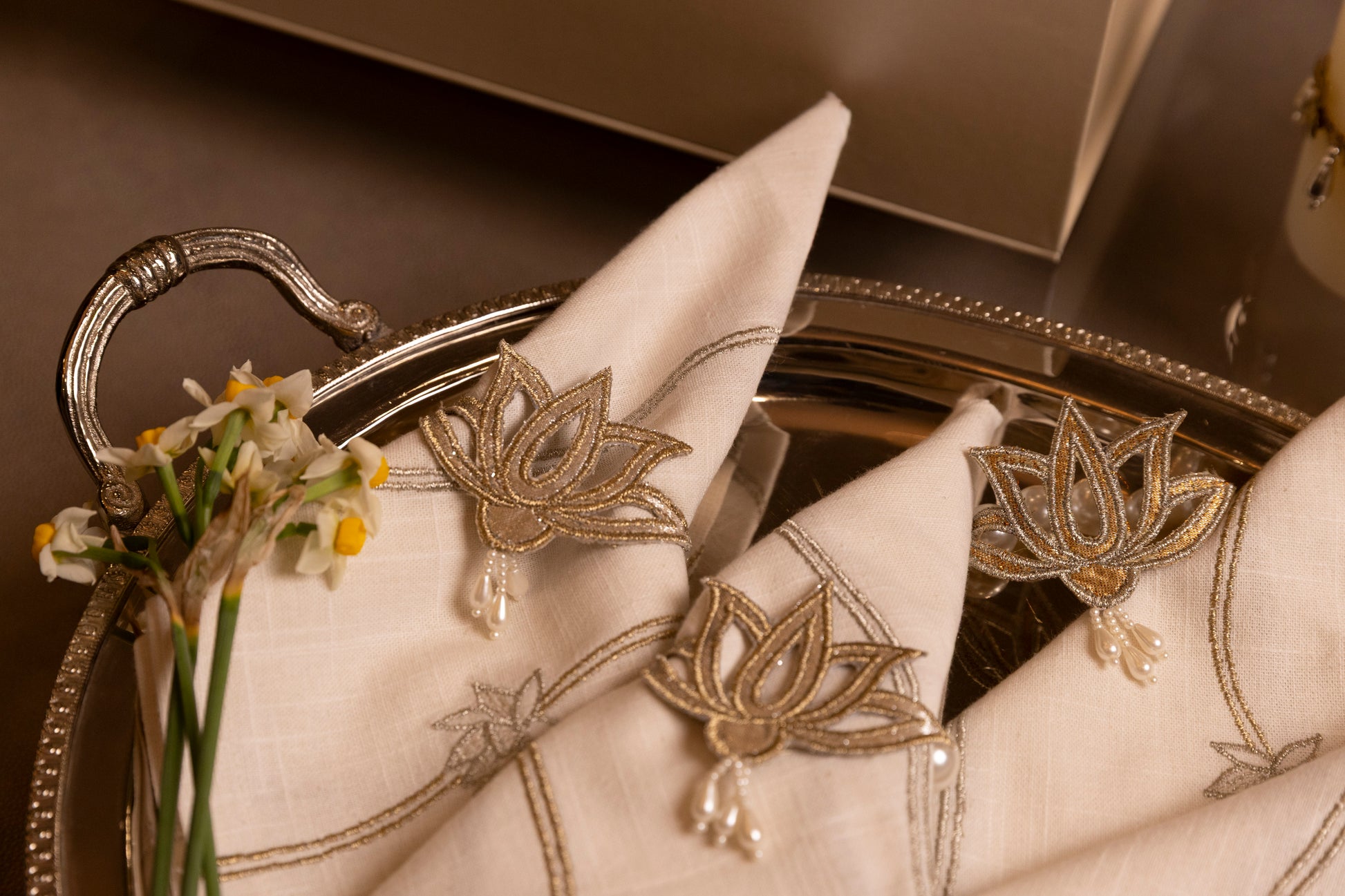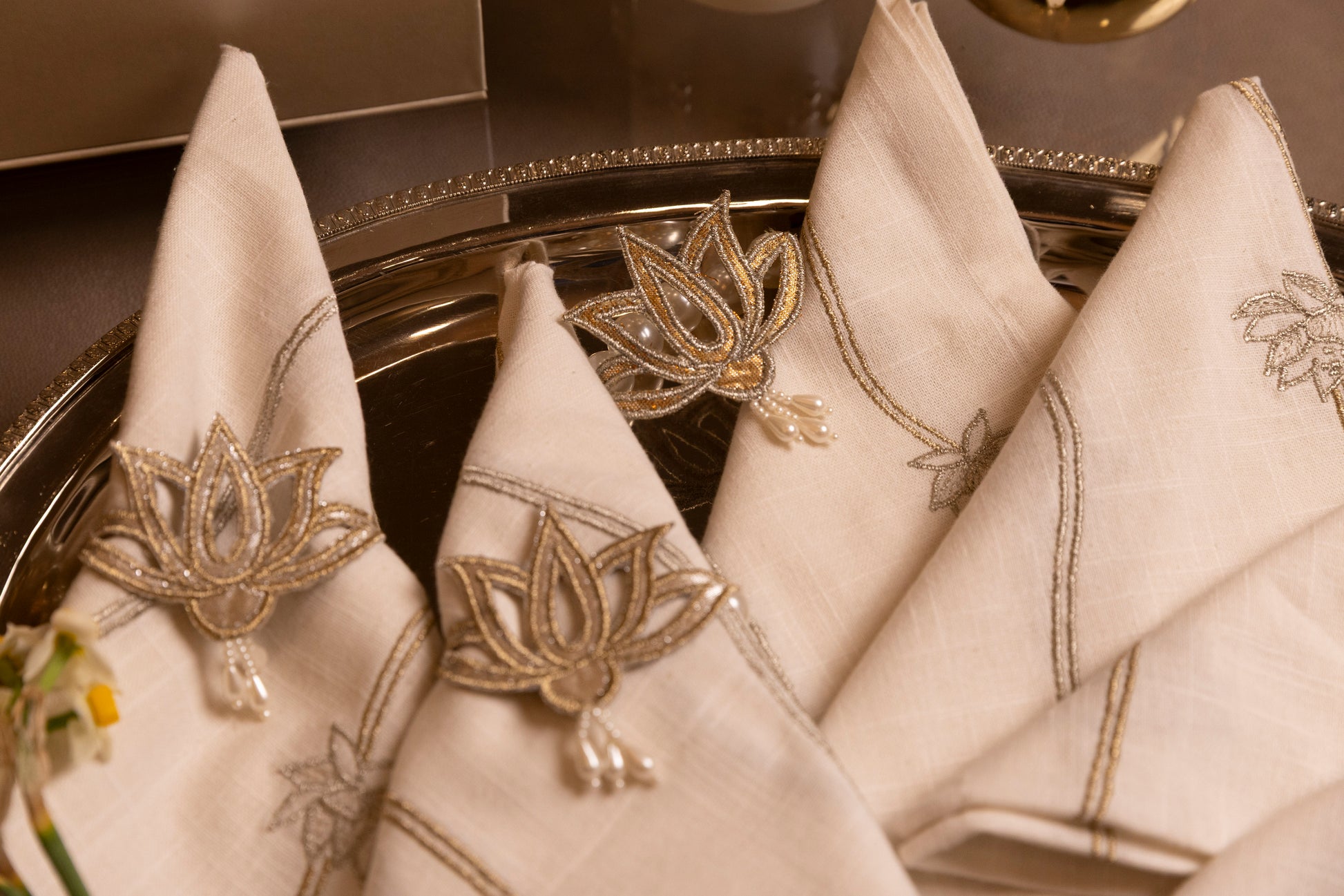 These classic white napkins are exquisitely finished with a minimalist border, setting the stage for a refined table setting. But it’s the golden lotus cutwork napkin rings that steals the show.